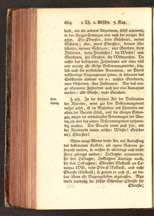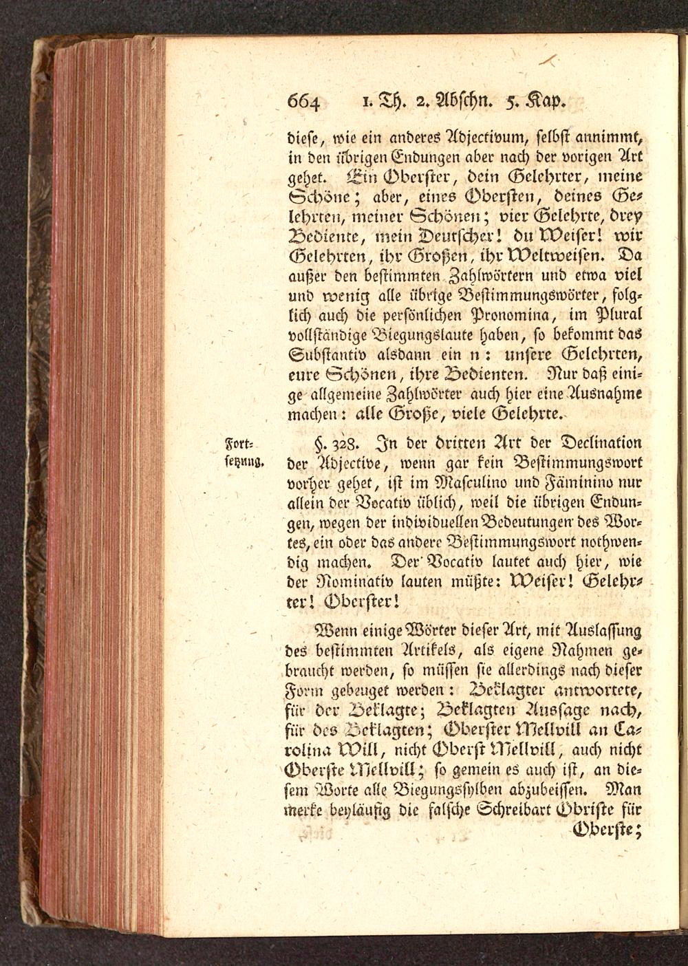 seynng. Adjective, wenn gar kein Bestimmungswortvorher gehet, ist im Masculino und Fäminino nurallein der Vocativ üblich, weil die übrigen Endun-gen, wegen der individuellen Bedeutungen des Wor-tes, ein oder das andere Bestimmungswort nochwen-dig machen. Der'Vocativ lautet auch hier, wieder Nominativ lauten müßte: Weiser! Gelehr-ter! Oberster!