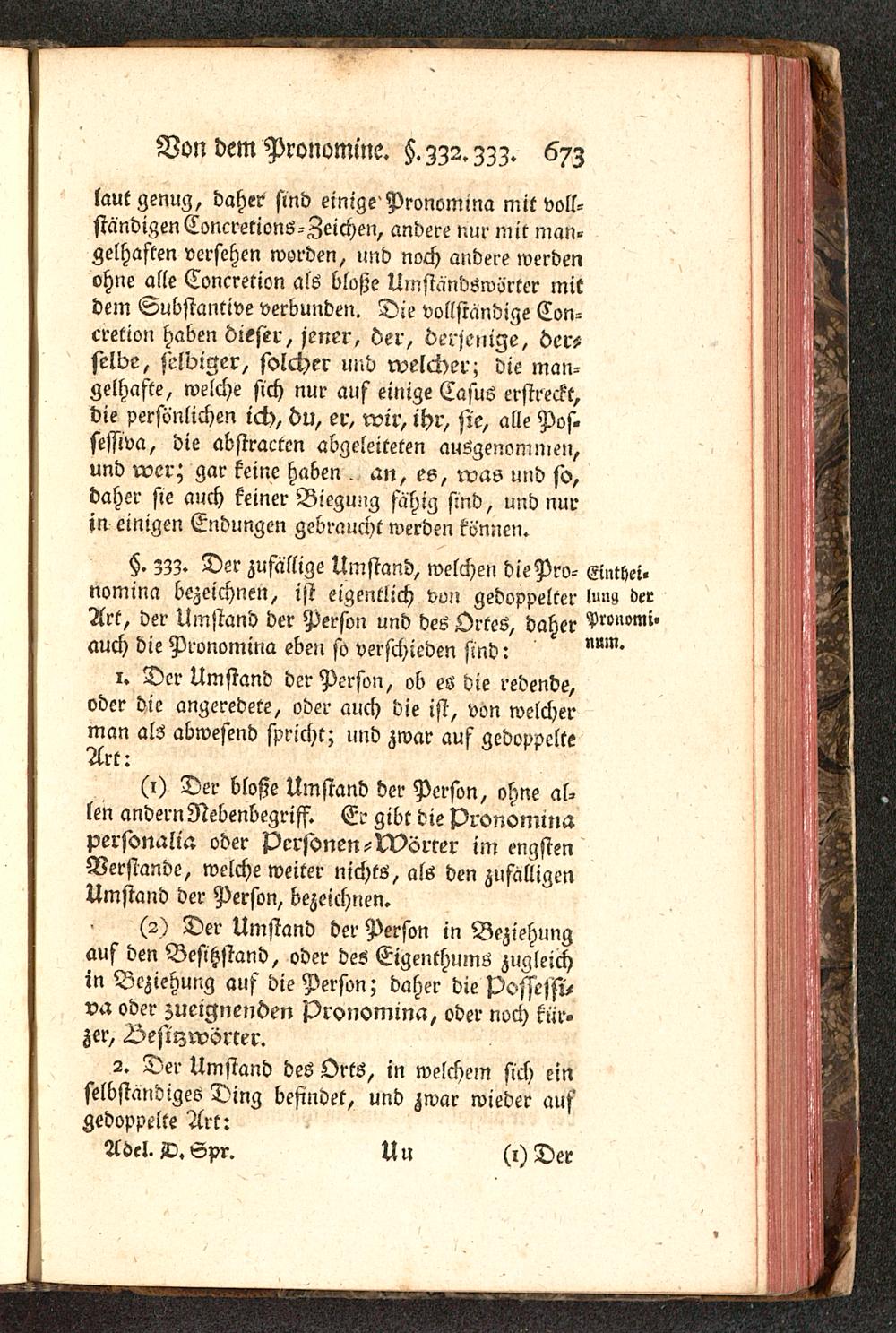 §. ??Z. Der zufällige Umstand, welchen diePro- Emthei-nomina bezeichnen, ist eigentlich von gedoppelter luug derArt, der Umstand der Person und des OrteS, daher Pronomi -auch die Pronomina eben fo verschieden sind: