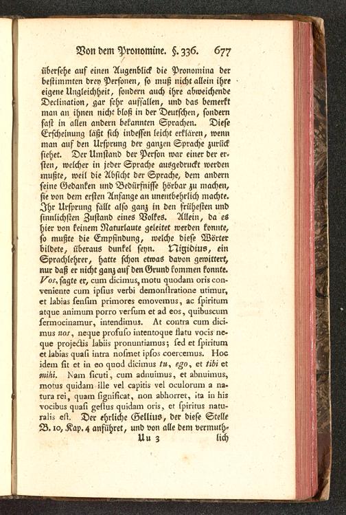 übersehe auf einen Augenblick die Pronomina derbestimmten drey Personen, so muß nicht allein ihreeigene Ungleichheit, sondern auch ihre abweichendeDeclination, gar sehr auffallen, und das bemerktman an ihnen nicht bloß in der Deutschen, sondernfast in allen andern bekannten Sprachen. DieseErscheinung läßt sich indessen leicht erklären, wennman auf den Ursprung der ganzen Sprache zurücksiehet. Der Umstand der Person war einer der er-sten, welcher in jeder Sprache ausgedruckt werdenmußte, weil die Absicht der Sprache, dem andernseine Gedanken und Bedürfnisse hörbar zu machen,sie von dem ersten Anfange an unentbehrlich machte.Ihr Ursprung fällt also ganz in den frühesten undsinnlichsten Zustand eines Volkes. Allein, da eshier von keinem Naturlaute geleitet werden konnte,so mußte die Empfindung, welche diese Wörterbildete, überaus dunkel seyn, t^lgldtus, einSprachlehrer, hatte schon etwas davon gewittert,nur daß er nicht ganz auf den Grund kommen konnte.^0/, sagte er, cum äicimux, motu c^uocism c>ris cou-veuients cum iplius vsrbi ciemouitrstidue utimur,et Isoiss leulun orimorez emovemus, ac spiritumstc^ue auimum oorro verlum et z»6 eoz, c^uibuscum/ermociusmur, mteuuimu;. ^t coutig cum cjici.muz no/, necme protulo iuteuto^ue t^stu vociz nc-c^ue projsälis laiziix pronuutigmux; lcu et sjiiritumet labiax c^usll iutra uo5met iptv!> coeiccmus. ^ociuem üt et in sc> c^uou uicimu5 eA», et //ö? et^sm t'icuti, cum sanuimuz, et 2vuuimus,motus c^uiäzm ille vel cgvitiii vel oculorum Ä ua.turarei, c^usm kiAuilicgt, nc>u sbliorret, »ta in uisvociliuz c^usli ^eltu« c^uiägm oris^ et spiritus nstu-rsli» el^. Der ehrliche Gellius, der diese StelleB. ic>, Kap. 4 anführet, und von alle dem vermuth-