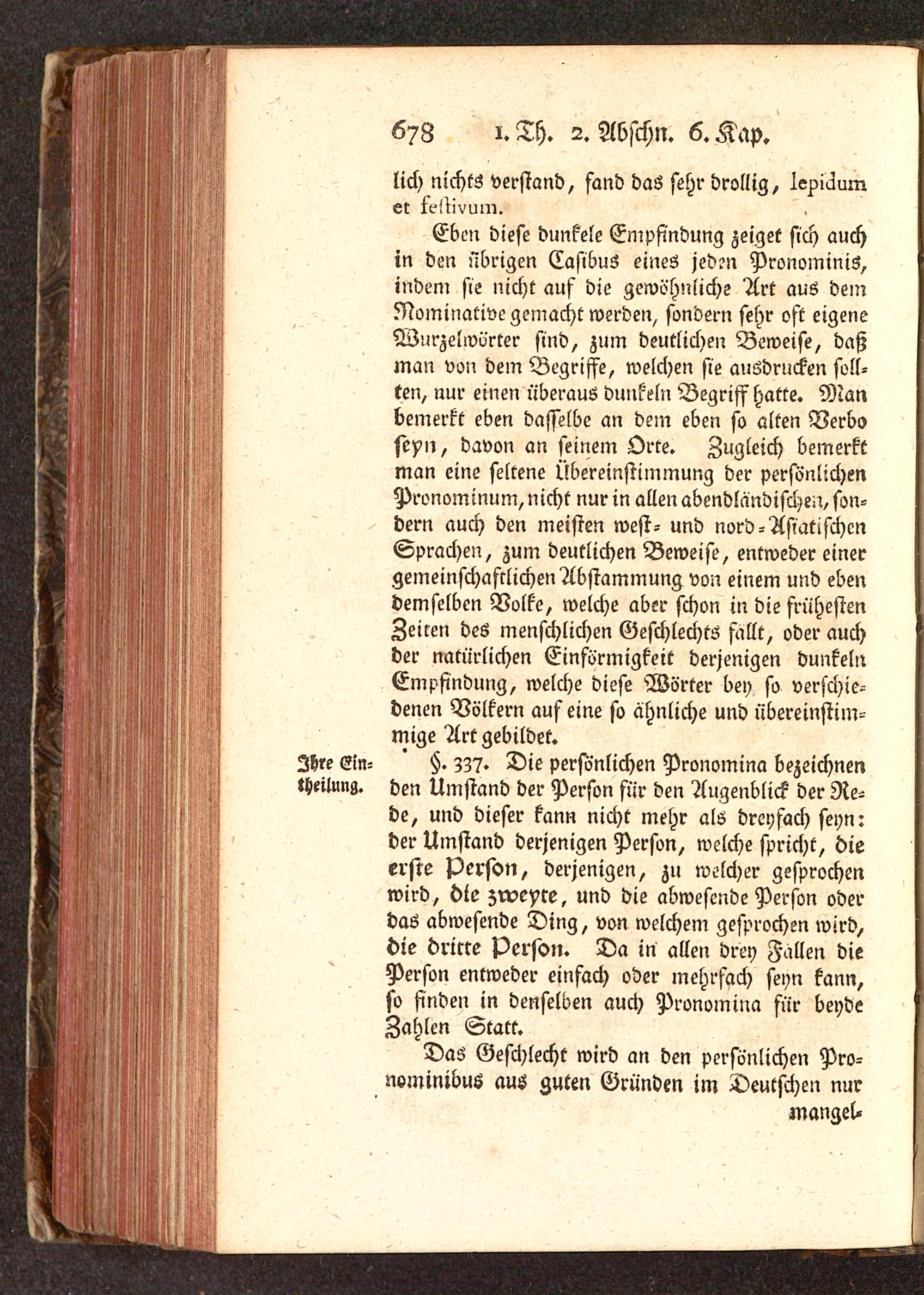 Eben diese dunkele Empfindung Zeiget sich auchin den übrigen CasibuS eines jeden Pronominis,indem sie nicht auf die gewöhnliche Art aus demNominative gemacht werden, sondern sehr oft eigeneWnrzelwörter sind, zum deutlichen Beweise, daßman von dem Begriffe, welchen sie ausdrucken soll-ten, nur einen überaus dunkeln Begriff hatte. Manbemerkt eben dasselbe an dem eben so alten Verbosey», davon an seinem Orte. Zugleich bemerktman eine seltene Übereinstimmung der persönlichenPronominum, nicht nur in allen abendländischen, son-dern auch den meisten west- und nord-AsiatischenSprachen, zum deutlichen Beweift, entweder einergemeinschaftlichen Abstammung von einem und ebendemselben Volke, welche aber schon in die frühestenZeiten des menschlichen Geschlechts fallt, oder auchder natürlichen Einförmigkeit derjenigen dunkelnEmpfindung, welche diefe Wörter bey so verschie-denen Völkern auf eine so ahnliche und übereinstim-mige Art gebildet.Ihre Sin- ' §.???. Die persönlichen Pronomina bezeichnentheilung. den Umstand der Person für den Augenblick der Re-de, und dieser kann nicht mehr als dreyfach seyn:der Umstand derjenigen Person, welche spricht, dieerste Person, derjenigen, zu welcher gesprochenwird, die zrveyre, und die abwesende Person oderdas abwesende Ding, von welchem gesprochen wird,die dritte Person. Da in allen drey Fallen diePerson entweder einfach oder mehrfach seyn kann,so finden in denselben auch Pronomina für beydeZahlen Statt.