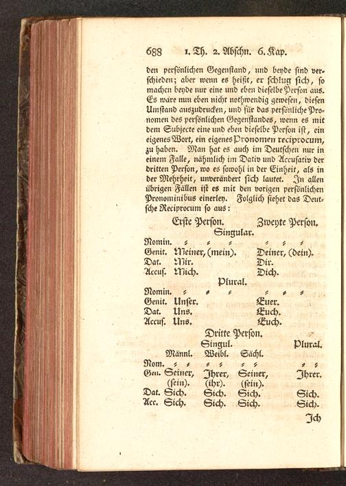 den persönlichen Gegenstand, und beyde sind ver.schieden; aber wenn es heisit, er schlug sich, somachen beyde nur eine und eben dieselbe Person aus.Es wäre nun eben nicht nothwendig gewesen, diesenUmstand auszudrucken, und für das persönliche Pro-nomen des persönlichen Gegenstandes, wenn es mitdem Subjecte eine und eben dieselbe Person ist, eineigenes Wort, ein eigenes Pronomen reciprocum,zu haben. Man hat es auch im Deutschen nur ineinem Falle, nähmlich im Dativ und Accusativ derdritten Person, wo es sowohl in der Einheit, als inder Mehrheit, unverändert sie!) lautet. In allenübrigen Fällen ist es mit den vorigen persönlichenPronomimbus einerley. Folglich siehet das Deut-sche Reciprocum so aus: