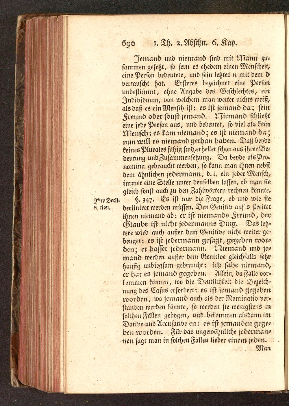 Jemand und niemand sind mit Mann zu-sammen gesetzt, so fern es ehedem einen Menschen,eine Person bedeutete, und sein letztes n mit dem dvertauscht hat. Ersteres bezeichnet eine Personunbestimmt, ohne Angabe des Geschlechtes, ein, Individuum, von welchem man weiter nichts weiß,als daß eö ein Mensch ist: es ist jemand da: seinFreund oder sonst jemand. Niemand schließteine jede Person aus, und bedeutet, so viel als keinMensch: es kam niemand; es ist niemand da;nun rvill es niemand gethan haben. Daß beydekeines Plurales fähig sind,ei hellet schon aus ihrer Be-deutung undZusammensetzung. Da beyde alsPro-nomina gebraucht werden, so kann man ihnen nebstdem ähnlichen jedermann, d.i. ein jeder Mensch,immer eine Stelle unter denselben lasten, ob man siegleich sonst auch zu den Zahlwörtern rechnen könnte.I^reDecli- §. Z47- Es ist nur die Frage, ob und wie sie« risn. decliniret werden müssen. Den Genitiv auf s streitetihnen niemand ab: er ist niemanbs Lreund, derGlaube ist nicbc jedermanns Ding. Das letz-tere wird auch außer dem Genitive nicht weiter ge-beuget: es ist jedermann gesagt, gegeben wor-den; er Hasser jedermann. Niemand und je-mand werden außer dem Genitive gleichfalls sehrhäufig unbiegsam gebraucht: ich sahe niemand,er hac es jemand gegeben. Mein, da Fälle vor-kommen können, wo die Deutlichkeit die Bezeich-nung des Casus erfordert: es ist jemand gegeben. rvorden, wo jemand auch a!6 der Nominativ ver-standen werden könnte, so werden sie wenigstens insolchen Fällen gebogen, und bekommen alsdann imDative undAccufative en: es ist jemanden gege-ben worden. Für das ungewöhnliche jrderman-nen sagt man in solchen Fällen lieber einem jeden.
