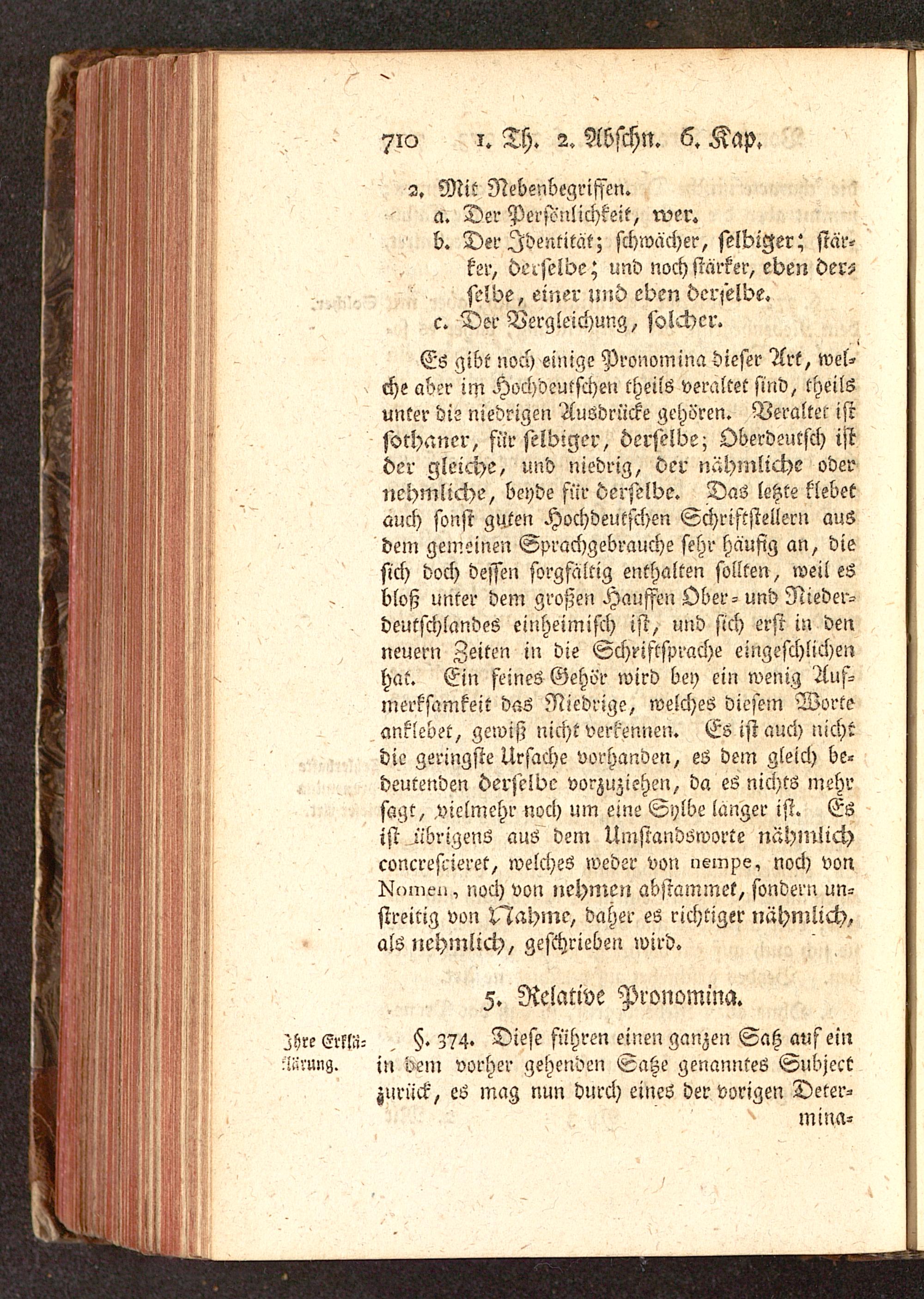 Es gibt noch einige Pronomina-dieser Art, wel-che aber im Hochdeutschen theils veraltet sind, theilsunter die niedrigen Ausdrucke gehören. Veraltet istssrhaner, für selbiger, derselbe; Oberdeutsch istder gleiche, und niedrig, der nähmliche odernehmliche, beyde für derselbe. Das letzte klebetauch sonst guten Hochdeutschen Schriftsteilern ausdem gemeinen Sprachgebrauche sehr häufig an, diesich doch dessen sorgfältig enthalten sollten , weil esbloß unter dem großen Haussen Ober - und Nieder-deutschlandes einheimisch ist, und sich erst in denneuern Zeiten in die Schriftsprache eingeschlichenhat. Ein feines Gehör wird bey ein wenig Auf-merksamkeit das Niedrige, welches diesem Worteanklebet, gewiß nicht verkennen. Es ist auch nichtdie geringste Ursache vorhanden, es dem gleich be-deutenden derselbe vorzuziehen, da es nichts mehrsagt, vielmehr noch um eine Sylbe langer ist. Esist übrigens aus dem Umstandsworte nähmlichconcrestieret, welches weder von nsmpe, noch vonFlomen, noch von nehmen abstammet, sondern un-streitig von Nahme, daher es richtiger nähmlich,als nehmlich, geschrieben wird.