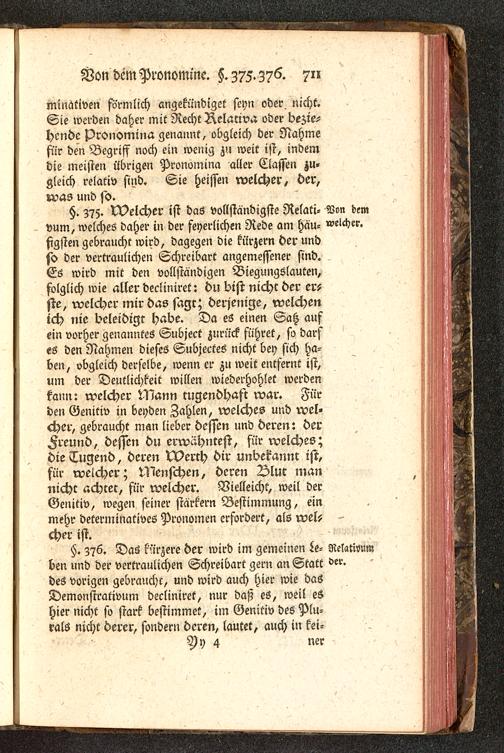 §. 376. Das kürzere der wird im gemeinen !e- Relativ»»«den und der vertraulichen Schreibart gern an Statt der.des vorigen gebraucht, und wird auch hier wie dasDemonstrativum deeliniret, nur daß es, weil eshier nicht so stark bestimmet, im Genitiv des Plu-rals nicht derer, sondern deren, lautet, auch in kei-