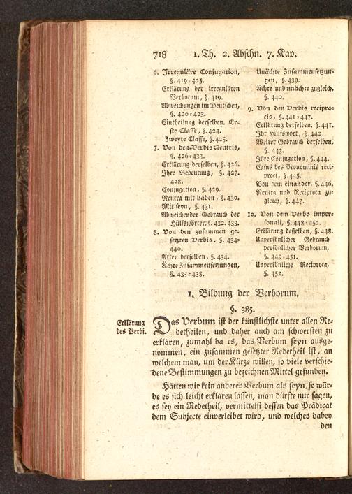 Erklärung ^^as Verbum ist der künstlichste unter allen Nei-des Verbi , detheilen, und daher auch am schwersten zuerklären, zumahl da es, das Verbum jeyn ausge-nommen, ein zusammen gesetzter Redetheil ist, anwelchem man, Um derKürze willen, so viele verschie-dene Bestimmungen zu bezeichnen Mittel gefunden.