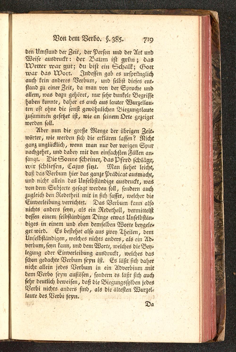 den Umstand der Zeit, der Person und der Art undWeise ausdruckt: der Vaum ist grün; daslVerrer war gut; du bist ein Schalk; Gorewar das IVorr. Indessen gab es ursprünglichauch kein anderes Verbum, und selbst dieses ent-stand zu einer Zeit, da man von der Sprache undallem, was dazu gehöret, nur sehr dunkele Begriffehaben konnte, daher es auch aus lauter Wurzellau-ten oft ohne die sonst gewöhnlichen Biegungslautezusammen gesetzet ist, wie an seinem Orte gezeigetwerden soll.