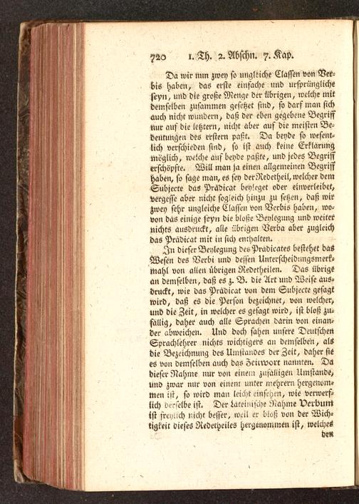 Da wir Mm zwey so ungleiche Classen von Ver-bis haben, das erste einfache und ursprünglicheseyn, und die große Menge der Ädrigen, welche mitdemselben zusammen gesetzet sind, so darf man sichauch nicht wundern, daß der eben gegebene Begriffnur auf die letztem, nicht aber auf die meisten Be-deutungen des erstem paßt» Da beyde so wesent-lich verschieden sind, so ist auch keine ErklärungMöglich, welche auf beyde paßte, und jedes Begrifferschöpfte. Will man ja einen allgemeinen Begriffhaben, so sage man, es sey derRedetheil, welcher demSubjecte das Prädicat beyleget oder einverleibet,vergesse aber nicht sogleich hinzu zu seßen, daß wirZwey sehr ungleiche Classe»! von VerbiS haben, wo-von das einige seyn die bloße Beylegung und weitetNichts ausdruckt, alle übrigen Verba aber zugleichdas Pradicat mit in sich enchalten.