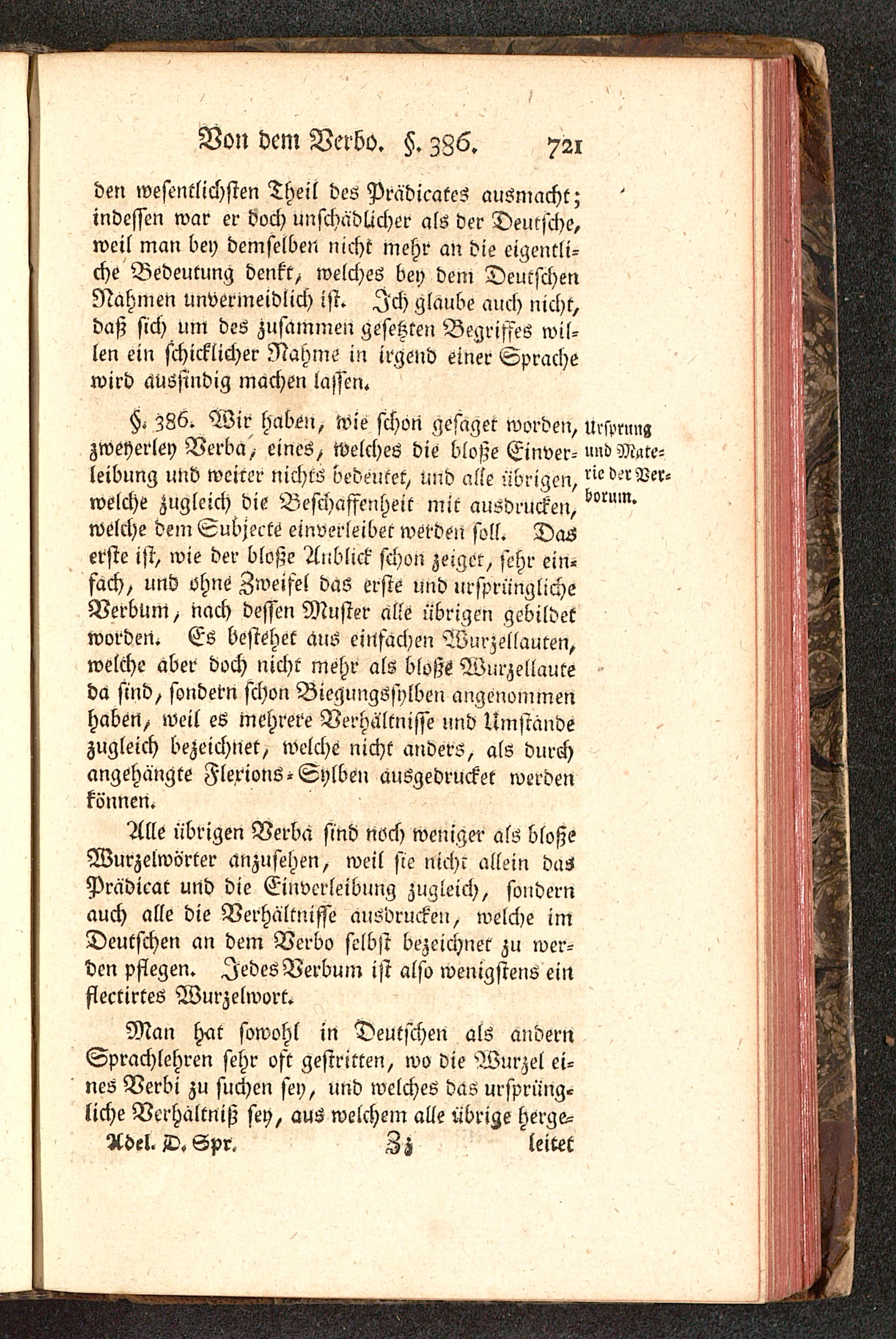 Man hat sowohl in Deutschen als andernSprachlehren sehr oft gestritten, wo die Wurzel ei-nes Verbi zu suchen sey, und welches das ursprüng-liche Verhältniß sey, aus welchem alle übrige herge-AdeI.jL.Spr. Zz leitet