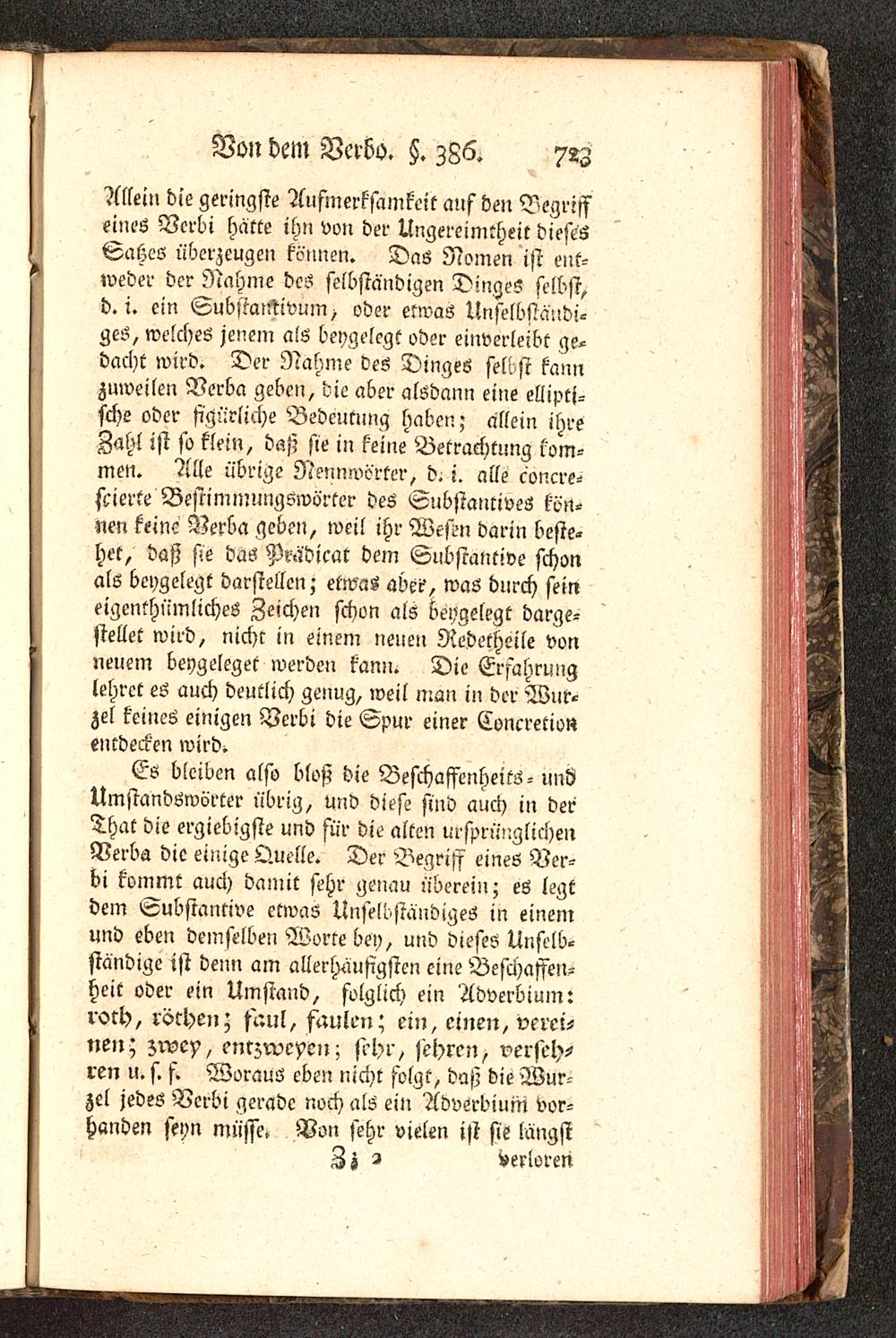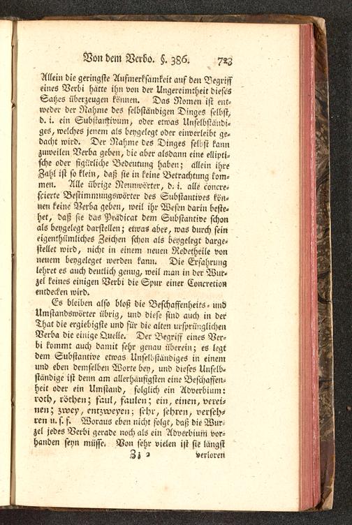 Allem die geringste Aufmerksamkeit auf den Begriffeines Verbi hatte ihn von der Ungereimtheit diesesSahes überzeugen können. Das Nomen ist ent-weder der Nahme des selbständigen Dinges selbst,d.i. ein SubstcuttivuM) oder etwas Unselbständi-ges, welches jenem als beygelegt oder einverleibt ge-dacht wird. Der Nahme des Dinges selbst kannzuweilen Verba geben, die aber alsdann eine ellipti-sche oder figürliche Bedeutung haben; allein ihreZahl ist so klein, daß sie in keine Betrachtung kom-men. Alle übrige Nennwörter, K i. alle concre-scierte Bestiminungswörter des Substantives kön-nen keine Verba geben, weil ihr Westn darin beste-het, daß sie das Pmdicat dem Substantive schonals beygelegt darstellen; etwas abei?, was durch seineigenthümliches Zeichen schon als beygelegt darge-stellet wird, nicht in einem neueil Nedetheile vonneuem beygeleget werden kann. Die Erfahrunglehret es auch deutlich genug, weil man in der Wur-zel keines einigen Verbi die Spur einer Concretionentdecken wird^