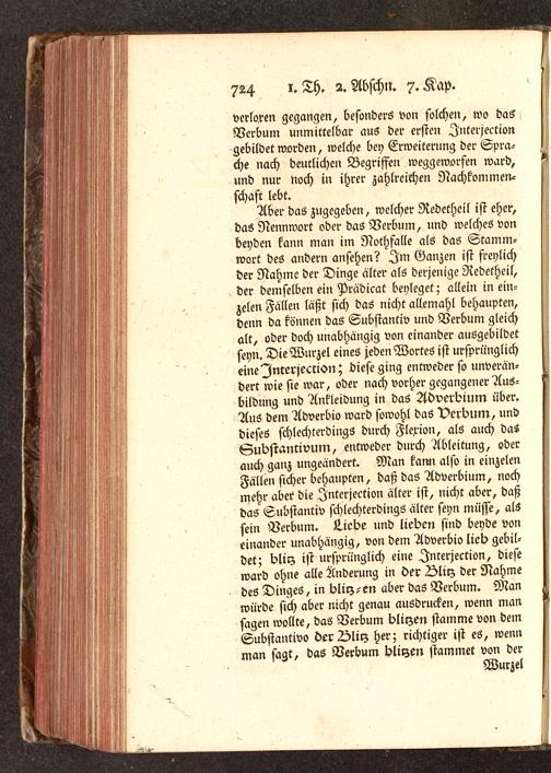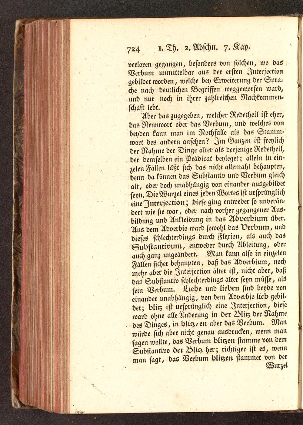 Aber das zugegeben, welcher Redethcil ist eher,das Nennwort oder das Verbum, und welches vonbeyden kann man im Nothfalle als das Stamm-wort des andern ansehen? Im Ganzen ist freylichder Nahme der Dinge älter als derjenige Redetheil,der demselben ein Prädicat beyleget; allein in ein-zclen Fällen läßt sich das nicht allemahl behaupten,denn da können das Substantiv und Verbum gleichalt, oder doch unabhängig von einander ausgebildetseyn. Die Wurzel eines jeden Wortes ist ursprünglicheine Interjection; diese ging entweder so unverän-dert wie sie war, oder nach vorher gegangener Aus-bildung und Ankleidung in das Adverbium über.Aus dem Adverbio ward sowohl das Verbum, unddieses schlechterdings durch Flexion, als auch dasSubstantivum, entweder durch Ableitung, oderauch ganz ungeändert. Man kann also in einzelcnFällen sicher behaupten, daß das Adverbium, nochmehr aber die Interjection älter ist, nicht aber, daßdas Substantiv schlechterdings älter seyn müsse, alssein Verbum. ü.icbe und lieben sind beyde voneinander unabhängig, von dem Adverbio lieb gebil-det; blirz ist ursprünglich eine Interjection, dieseward ohne alle Änderung in der Olirz der Nahmedes Dinges, in bliy--en aber das Verbum. Manwürde sich aber nicht genau ausdrucken, wenn mansagen wollte, das Verbum blirzen stamme von demSubstantivs derDliy her; richtiger ist es, wennman sagt, das Verbum bliyen stammet von der