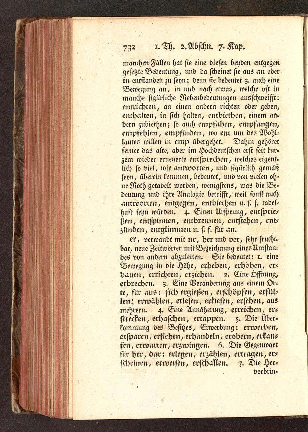 er, verwandt mit ur, her und ver, sehr frucht-bar, neue Zeitwörter mitBezeichnung eines Umstan-deö von andern abzuleiten. Sie bedeutet: 1. eineBewegung in die Höhe, erheben, erhöhen, er-bauen, errichten, erziehen. 2. Eine Öffnung,erbrechen, z. Eine Veränderung aus einem Or-te, für aus: stch ergießen, erschöpfen, erfül-len; erwählen, erlesen, erkiesen, ersehen, ausmehrern. 4. Eine Annähermig, erreichen, er-strecken, erHaschen, ertappen. 5. Die Über-kommung des Besitzes, Erwerbung: erwerben,ersparen, erstehen, erhandeln, erobern, erkau-fen, erwarten, erzwingen. 6. Die Gegenwartfür her, dar: erlegen, erzählen, ertragen, er-scheinen, erweisen, erschallen. 7. Die Her--