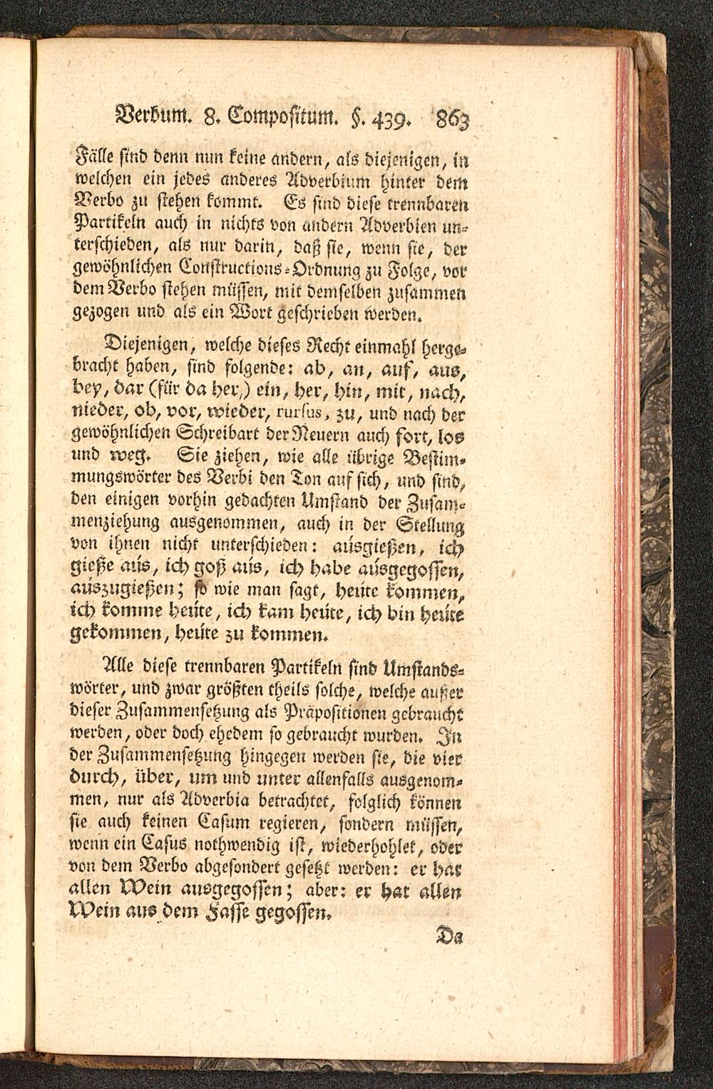 Alle diese trennbaren Partikeln sind Umstands-wörter, und zwar größten theils solche, welche auf?erdieser Zusammensetzung als Präpositionen gebrauchtwerden, oder doch ehedem so gebraucht wurden. Inder Zusammensetzung hingegen werden sie, die vierdurch, über, um und unter allenfalls ausgenom-men, nur als Adverbia betrachtet, folglich könnensie auch keinen Casum regieren, sondern müssen,wenn ein Casus nothwendig ist, wicderhohlet, odervon dem Verbo abgesondert gesetzt werden: er hatallen Mein aue-gegossen; aber: er hsr allenlVein aus dem Fasse gegossen»