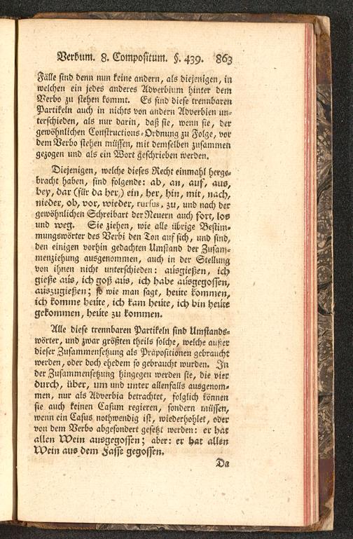 Fälle sind denn nun keine andern, als diejenigen, mwelchen ein jedes anderes Adverbium hinter demVerbo zu stehen kommt. Es sind diese trennbarmPartikeln auch in nichts von andern Adverbien un-terschieden, als nur darin, daß sie, wenn sie, dergewöhnlichen Constructions-Ordnung zu Folge, vordem Verbo stehen müssen, mit demselben zusammengezogen und als ein Wort geschrieben werden.