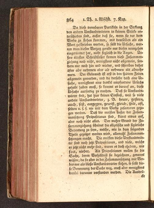 Da diese trennbaren Partikeln in der Stellungvon andern Umstandswörtern in keinem Stücke un-terschieden sind, außer daß sie, wenn sie vor demVerbo zu stehen kommen, mit demselben als emWort geschrieben werden, so fallt die Ursache, war.um man diesen Vorzug gerade nur diesen neunzeheneingeräumet hat, nicht sogleich in die Augen. Un-sere aitesten Schriftsteller kennen diese Zusammen-zichung noch nicht, wenigstens nicht allgemein, son-dern nur noch hin und wieder, und schreiben daheröfter abe nehmen oder ab nehmen als abneh-men. Der Gebrauch ist erst in den spätern Zeitenallgemein geworden, und da derselbe doch eine Ur-sache, wenigstens eine dunkel empfundene Ursachegehabt haben muß, so kommt es darauf an, dieseUrsache ausfindig zu machen. Daß sie Umstands-wörter sind, hat hier keinen Einfluß, weil so vieleandere Umstandswörter, z. B. heure, gestern,auch, fest, entgegen, gewiß, gleich , spät, oft,selten u. s. f. nie mit dem Verbo zusammen gezo-gen werden. Daß die meisten außer der Zusam-mensetzung Präpositionen sind, kläret etwas auf,aber noch nicht alles. Der wahre Grund der Zu-sammenziehung scheinet die elliptische und figürlicheBeoeutung zu seyn, welche, wie in dem folgendenTheile gezeiget werden wird, allemahl Zusammen-setzungen macht. Die meisten dieser Umstandswör-ter sind noch jeßt Präpositionen, und viele, welchees jetzt nicht mehr sind, waren es doch ehedem, wiefsrr, nieder. Als Präpositionen wollen sie dieSache, deren Verhältniß sie bezeichnen, genanntwissen; da sie aber in der Zusammensetzung mit Ver-bis nur als bloße Umstandswörter stehen, so fällt die?se Benennung der Sache weg, muß aber wenigstensdunkel darunter verstanden werden. Die AuSdrü'