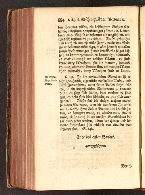 §. 452. In der vertraulichen Sprechart ist e6sehr gewöhnlich, eigentliche persönliche Verba, undselbst Intransitiva, wenn sie im Passiva stehen soll-ten, in ein unpersönliches Reciprocum zu verwan-deln: es sagt sich leicht, hier rvohnt es sichgut, es geht sich hier schlecht, es hat sich aus-gerirren. Dieses sind die einigen wahren unper-sönlichen Reciproca, denn die transitiven Imperso-nalia, welche ihren Casum Pronominis bey sich ha-ben, es hungert mich, es ahnder mir, sind esnicht, ob sie gleich in den meisten Sprachlehren da-für ausgegeben werden, indem der thätige und leüdcnde Gegenstand hier wirklich von einander ver-schieden sind. S. 448.