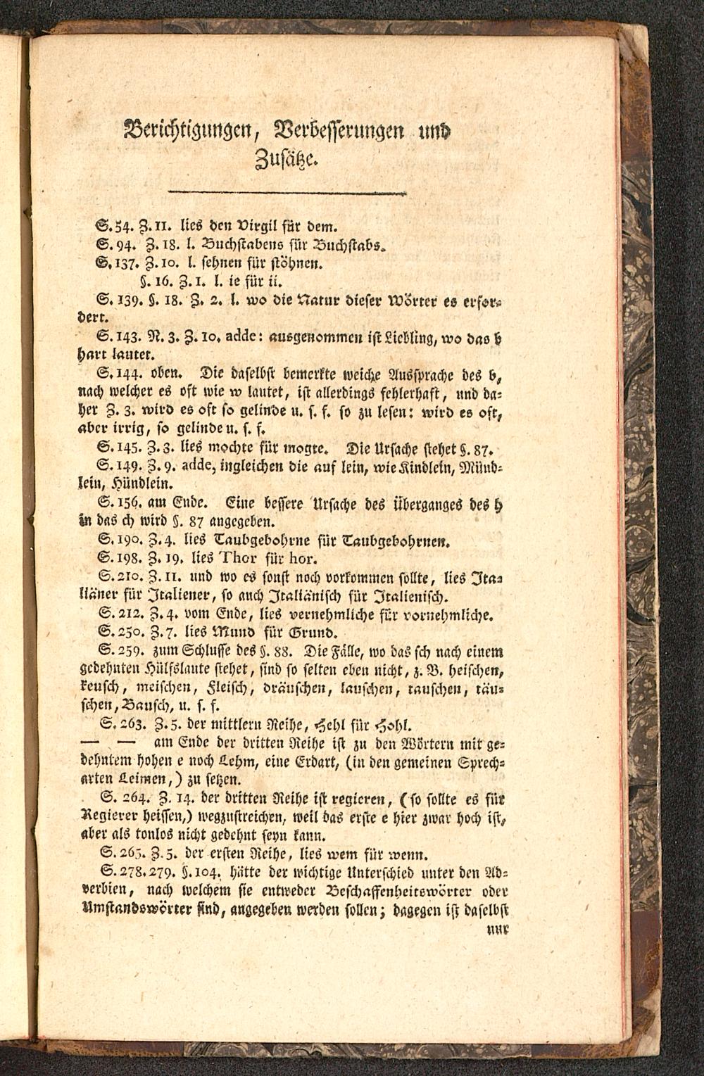 S. 264. Z, 14. der dritten Reihe ist regieren, ( so sollte es sürNegierer heissen,) wegzustreichen, weil das erste e hier zwar hoch ist,aber als tonlos nicht gedehnt seyn kann.