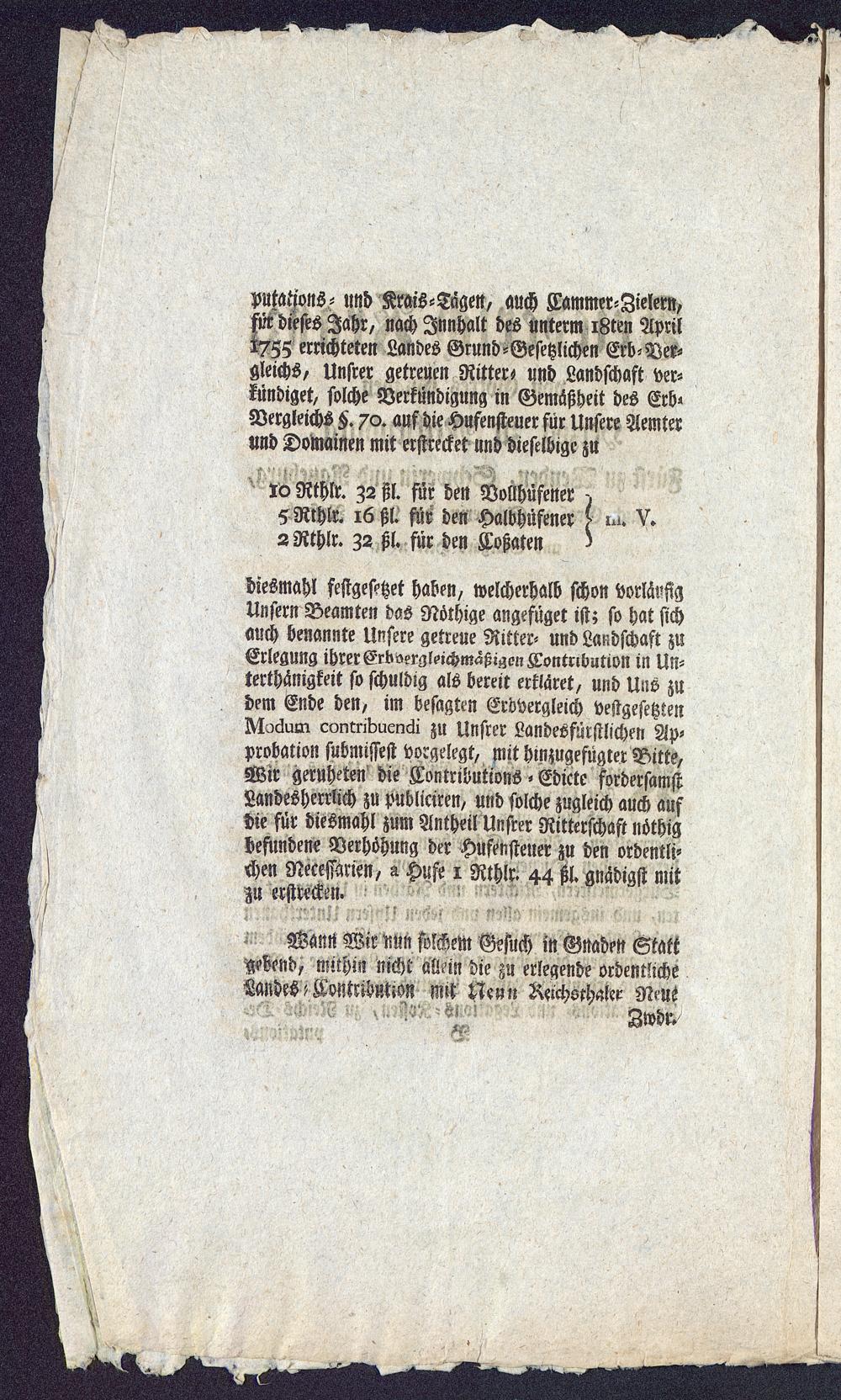 Mtations- und Kwis -Tagen, auch Kammer-Zielern,für dieses Jahr, nachJnnhalt des unterm i8ten April1755 errichteten Landes Grund-Gesetzlichen Erb-Ver-gleichs, Unsrer getreuen Ritter- und Landschaft ver-kündiget, solche Verkündigung in Gemäßheit des Erb«Vergleichs K. 70. auf die Hufensteuer für Unsere Aemterund Donmnen mit erstrecket und dieselbige zu