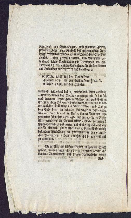 diesmahl festgesetzet haben, welcherhalb schon vorläufigUnsern Beamten das Nöthige angefüget ist; so hat sichauch benannte Unsere getreue Ritter- und Landschaft zuErlegung ihrer Erbsergleichmaßigen Konttlbution in Un-tertänigkeit so schuldig als bereit erklaret, und Uns zudem Ende den, im besagten Erdvergleich veftgesetztmUK6um conmbuenck zu Unsrer Landesfürstlichen Ap-probation subnnssest vorgelegt, mit hlnzugefügter Bitte,Wir geruheten die Tontributions - Edicte sordersamstLandesherrlich zu publiciren, und solche zugleich auch aufdie für diesmahl zum Antheil Unsrer Ritterschaft nöthigbefundene Verhöhung der Hufensteuer zu den ordentli-chen NeceWien, a Hufe 1 Rthlr. 44 ßl. gnädigst mitM erstrecken.