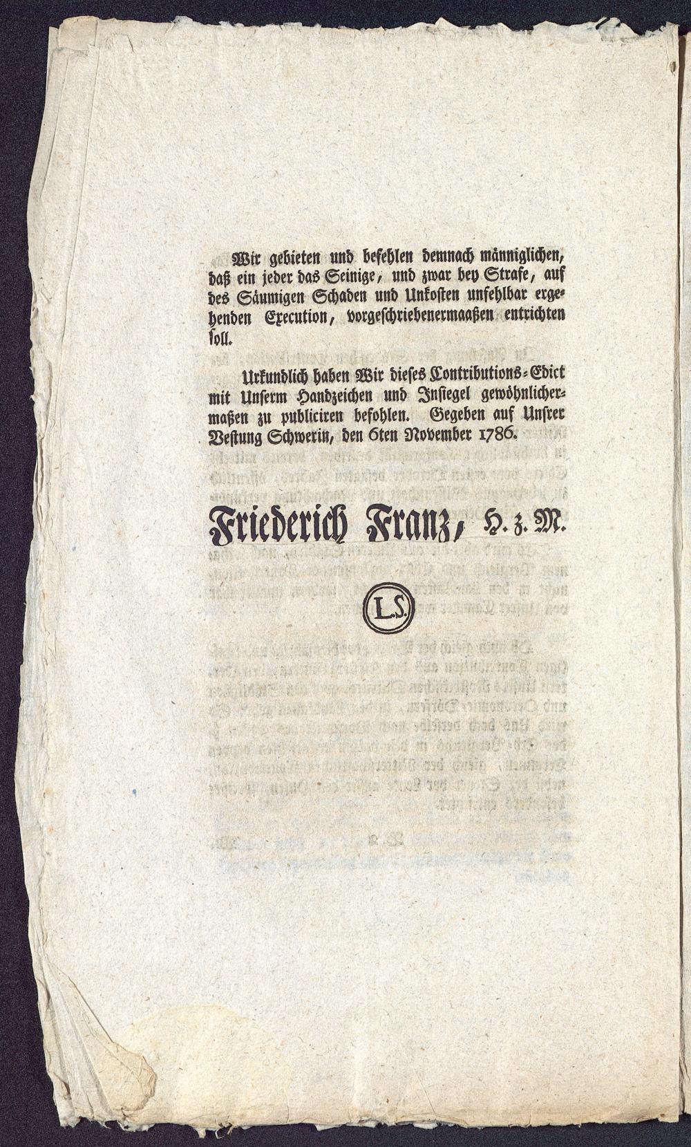 Urkundlich haben Wir dieses Tontributions-Edictmit Unserm Handzeichen und Jnstegel gewöhnlicher-maßen zu publiciren befohlen. Gegeben auf UnsrerVeftung Schwerin , den 6ten November 1786.