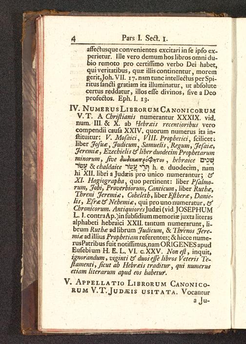 IV. NumerusLibrorumCanonicorumV. T. A Chriftianis numerancur XXXIX. vid.num. III. & X. ab Hebneis recentioribus verocompendii caufa XXIV. quorum numerus ica in-ftiruicur: V. Mofaici, VUL Prophetici, fcilicec;liber Jofue, Judicum, Samuelis, Regum, !jefai£ tJeremioe, Ezechielistf liber duodecim Prophetarumminorum, Jive $u$exet,7rfo<Pt}Tov , hebraice D\3$"itoy tkchaldaice "wy "in h. e. duodecim, namhi XII. libri a Judseis pro imico numerancur; &XL Hagiographa, quo percinenc: liber PJalmo-rum, Jobi, Proverbiorum, Canticum , liber Ruthtc,Threni Jeremiee, Coheleth ,liber Eftherae, Danie-, lis, Efrtetf Nehemi<e, quiprounonumeracur,Chronicorum. Antiquiores]udx\ (vid. JOSEPHUML. I. concraAp.)infublidiummemorisejuxcalicerasalphabeci hebraici XXII. cancum numerarunr, li-brum Ruthte ad librum Judicum, & Tlwenos $ere-mi<z ad illius Prophetiam references; & hicce nume-rusPacribus fuic nociflimus,nam ORIGENES apudEufebium H. E. L. VI. c.XXV. Noneft, inquir,ignorandimi, vtginti & duosejfe libros Veteris Te-ftamenti, Jicut ab Hebroeis traditur , qui numerusetiam literarum apud eos habetuf.