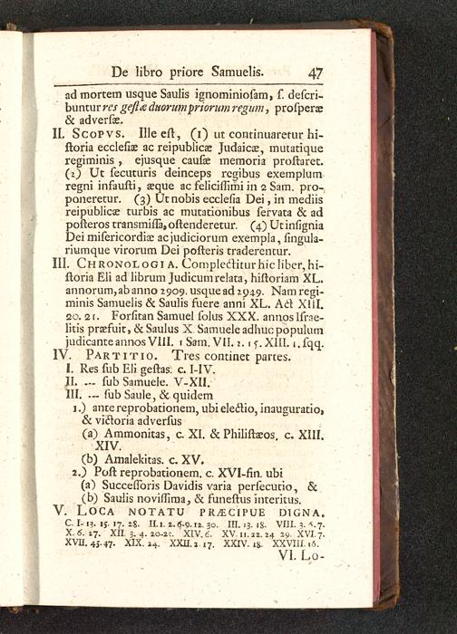 II. Scopvs. Illeeft, (i) ut continuaretur hi-ftoria ecclefwe ac reipublicae Judaicse, mutatiqueregiminis , ejusque caufae memoria proftaret.(2) Ut fecuturis deinceps rcgibus exemplumregni infaufti, aeque ac felicillimi in 2 Sam. pro-poneretur. (3) Utnobis ecclefia Dei, in mediisreipublicae turbis ac mutationibus fervata & adpofteros transmiiTa, oftenderetur. (4) Ut infigniaDei mifericordiae acjudiciorum exempia, fingula-riumque virorum Dei pofteris traderentur.