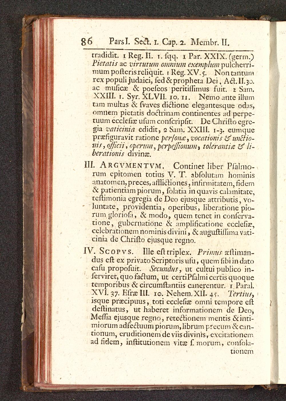 IV. Scopvs. Ille eft triplcx. Primus xlYimnn-dus cft ex privatoScriptorisufu, qucm fibiindatocafu propofuk. Secundus, ut cukui publico in-fervirct, quofaclum, ut certiPfalmiccrtisquoquctemporibus & circumftantiis canercntur. i.Paral.XVI. 37. Efraelll. 10. Nehem.XII. 4?., Tertius,isque praecipuus, toti ecclefiae omni tempore eftdeftinatus, ut haberet informationem de Deo,Meffia ejusque regno, retectionem mentis &inti-miorum adfecluum piomm,]ibrum precum &can-tionum, eruditionem de viisdivinis, exeitationemadfidem, inftitutionem vitoe f morum, confola-