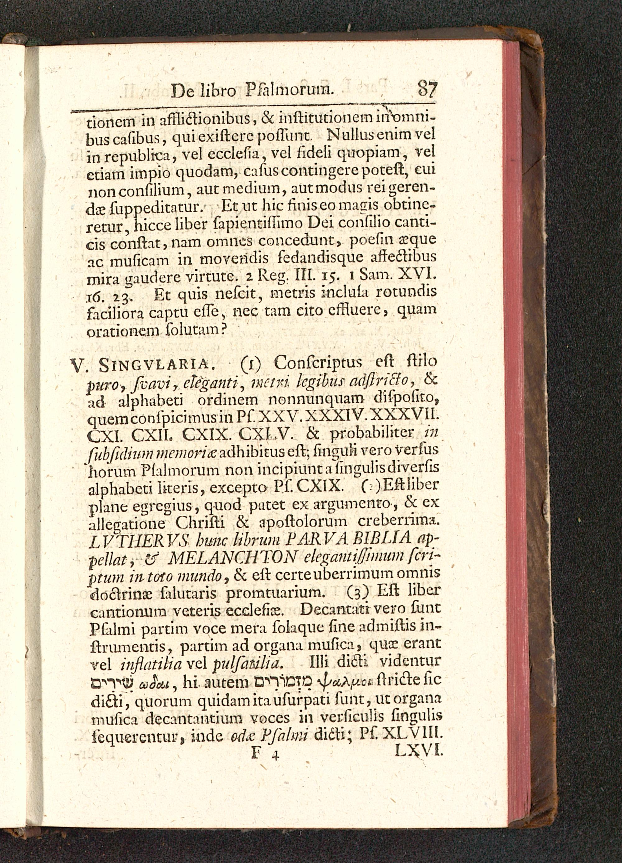 V. SlNGVLARlA. (1) Confcriptus cft ftilopuro, fvavi y cteganti, nictri lcgibus adftricfo, &ad alphabeti ordinem nonnunquam difpofito,quemconfpicimusinPf. XXV. XXXIV. XXXVII.CXI. CXII. CXIX. CXLV. & probabiliter hifubfidium wr;;;or/^adhibituseft; finguli vero Verfushorum Pfalmorum non incipiuntalingulisdiverfisalphabcti Ikeris, excepto Pf. CXIX. ( )Eftiiberplane egregius, quod putet ex argumento, & exallegatione Chrifti & apoftolorum creberrima.LVTHERVS bunc librum PARVA BIBLJA ap-pellat, & MELANCHTON elegantijjimum fcri-ptum intoto mundo, & eft certeuberrimum omnisdoclrinae falutaris promtuarium. (3) Eft libercantionum veteris ecclefite. Decantati vero funtPfalmi partim voce mera folaque fine admiftis in-ftrumentis, partim ad orgaiia mufica, quoe erantvel inflatilia vel pulfafiilia. Illi dicli videnturd^Tflj ai$eu , hi. autem EP^CTO ^pu^y.ci: ftricte iicdi&i, quorum quidamitaufufpati funt, utorganamufica decantantium voces in verficulis fingulisiequerentur, inde odx Pfalmi dicti; Pf XLVM.