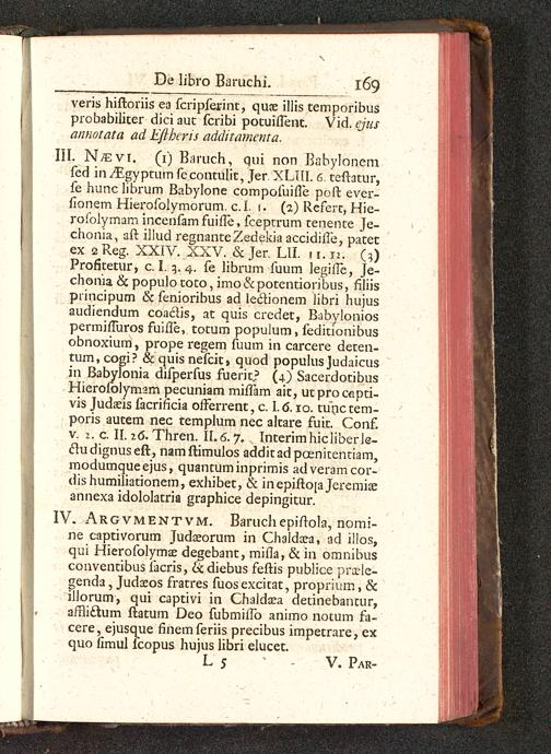 III. NjEvi. (i) Baruch, qui non Babylonenifed in yEgyptum fccontulit, Jer. XLlII. 6. teftatur,fe hunclibrum Babylone compofuiffe poft ever-fionem Hierofolymorum. c. I. 1. (2) Refert, Hie-rofolymam incenfamfuiffe, fceptrum tenente Je-chonia, aft iliud regnanteZedekia accidiffe, patetex 2 Reg. XXIV. XXV. & Jer. LII. 11.12. (3)Prorketur, c. I. 3. 4. fe librum fuum legiffe, Je-chonia & populo toto, imo & potentioribus, filiisprincipum & fenioribus ad lectionem libri hujusaudiendum coaclis, at quis credet, Babyloniospermiffuros fuiffe, totum populum, feditionibusobnoxium, prope regem fuum in carcere deten-tum.cogi? & quis nefcit» quod populus Judaicusin Babylonia difperfus fuerit.? (4) SacerdotibusHierofolymam pecuniam miflam ait, utproctipti-vis Judaeis facrificia oiFerrent, c. 1.6. 10. tunctem-poris autem nec templum nec altare fuit. Conf.v. 1. c. II. 16. Thren. \L6.7. Interimhicliberje-cludignuseft, namftimulos additadpcenitentiam,modumqueejus, quantuminprimis adveramcor-dishumiliationem, exhibet, & inepiftoja Jeremiseannexa idololatria graphice depingitur.
