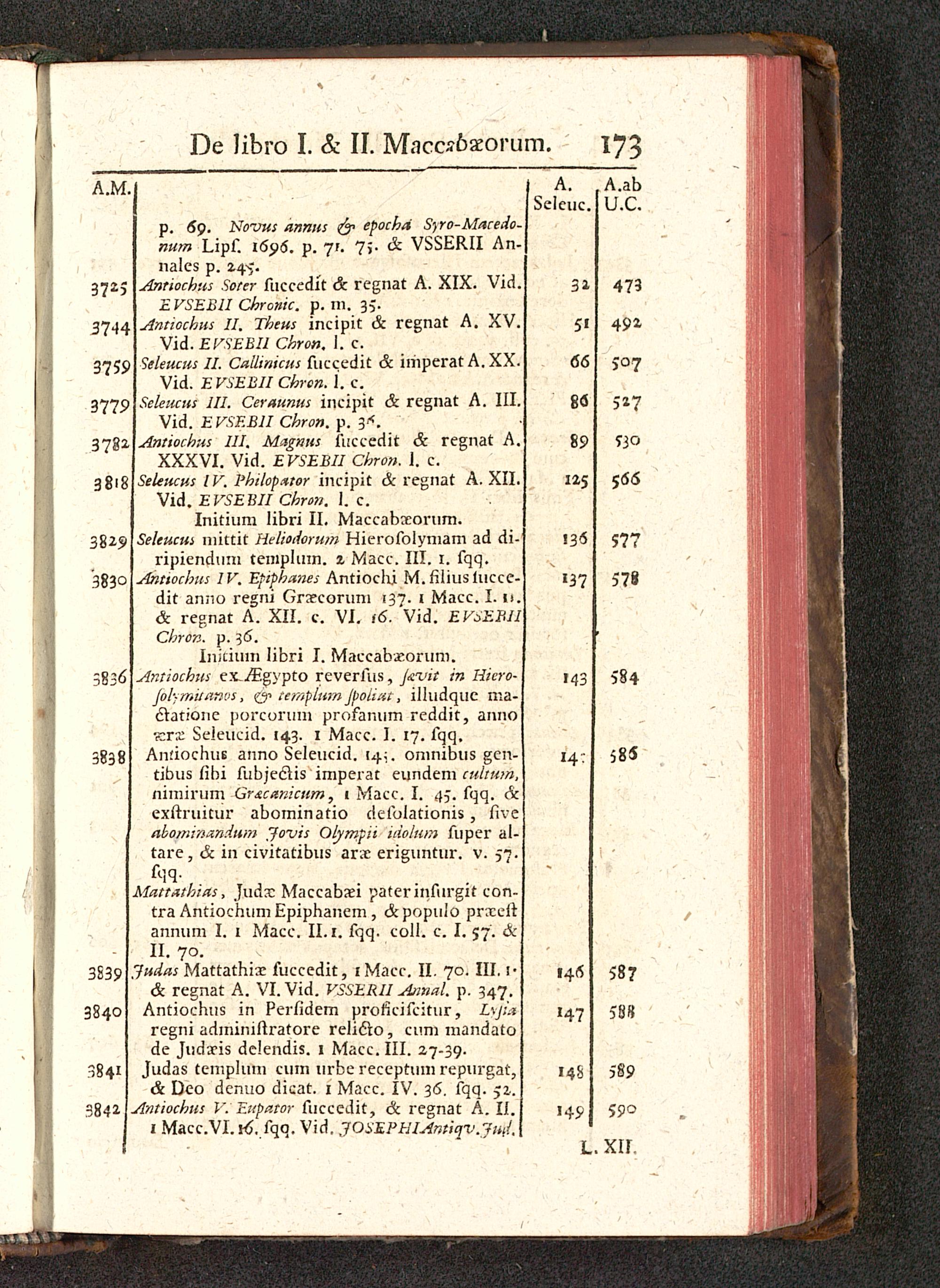 Initium Iibri I. Maccabxorum.583<5 Antiochus eX-jEgypto reverfus, fnnt in Hicro-[olymitanos, $> temflum Jfo/iat, illudque ma-ctatione porcoruin profanum reddit, anno■rtz Seleucid. 143. I Macc. I. 17. fqq.3838 Amiochue anno Seleucid. 14; . omnibus gen-tibus fibi fubjeclis imperat eundem cuhum,nimirum Gracttnicum, 1 Macc. I. 45. fqq. &exftruitur abominatio defolationis, fiveabaptinaridum Jovis Olympii idolum fuper al-tare, & in civitatibus arx eriguntur. v. 57.