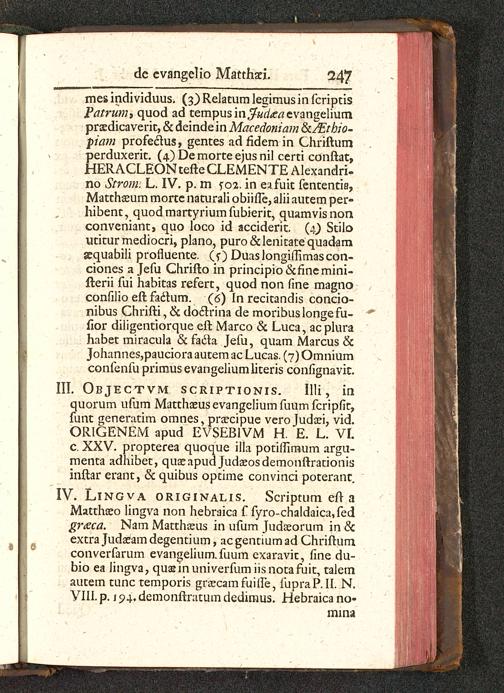 III. Objectvm scriptionis. Illi, inquorum ufum Matthaeusevangeliumfuumfcripfit,funt generatim omnes, prsecipue vero Judaei, vid.ORIGENEM apud EVSEBIVM H. E. L. VI.c. XXV. propterea quoque Hla potilhmum argu-menta adhibet, quaeapud Judaeosdemonftrationisinftar erant, & quibus optime convinci poterant.