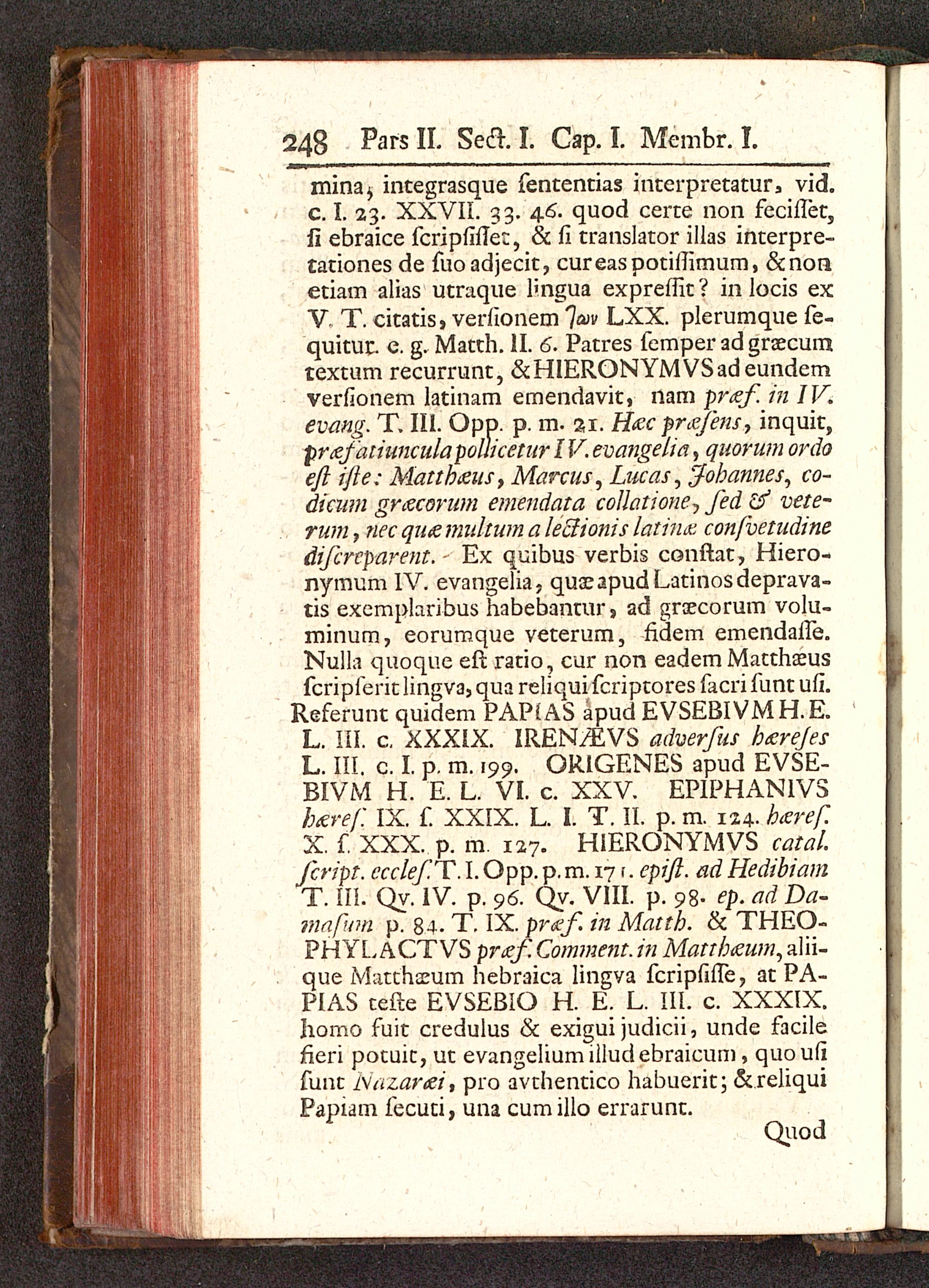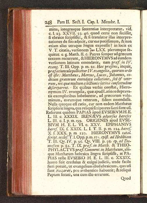 mina^ integrasque fententias interpretatur, vid.c. I. 23. XXVII. 33. 46. quod certe non feciilet,fi ebraice fcripfillee, & fi translator illas interpre-tationes de fuo adjecit, cureaspotiilimum, &nonetiam alias utraque lmgua expreffit ? in locis exV- T. citatis, verfionem Iwv LXX. plerumque fe-quitur. e. g. Matth. II. 6. Patres femper ad graecumtextum recurrunt, &HIERONYMVSadeundemverfionem latinam emendavit, nam pr<zf in IV.evang. T. III. Opp. p. m. %\. Hec prxfens , inquit,prctfatiunculapoliicetur IV. evangelia , quorum ordoefi i/le: Mattbieus, Marcus, Lucas, fobannes, co-dicum grtfcorum emendata colktione-, fed vete-rum, nec quzmultum a lectionis latinx, confvetudinedifcrvparent. Ex quibus verbis conftat, Hiero-nymum IV. evangelia, quaeapudLatinosdeprava-tis excmplaribus habebantur, ad groecorum volu-minum, eorumque veterum, fidem emendaife.Nulla quoque eft ratio, cur non eadem Matthasusfcripferit lingva, qua reliqui fcriptores facri funt ufi.Referunt quidem PAPiAS apud EVSEBIVMH.E.L. III. c. XXXIX. IREN^VS adverfus hcerejesL. III. c. t p. m. 199. ORIGENES apud EVSE-BIVM H. E. L. VI. c. XXV EPIPHANIVSbdref. IX. f. XXIX. L. I. T. II. p. m. 124- beref.X. f. XXX. p. m. 127. HIERONYMVS catal.fcript. ccclef.T. I. Opp. p. m. 171. cpift. ad HedibiamT. III. Qy. IV. p. 96. Qy. VIII. p. 98- ep. ad Da-mafum p. 84- T. IX. pr&f. in Mattb. & THEO-PHYLACTVS przf. Comment. in Mattbteum, alii-que Mattharum hebraica lingya fcripfifle, at PA-PIAS tefte EVSEBIO H. E. L. III. c. XXXIX.Jiomo fuit credulus & exigui judicii, unde facilerleri potuit, ut evangeliumilludebraicum, quoufifunt Ivazarai, pro avthentico habuerit; ckreliquiPapiam fecuti, una cumillo errarunt.