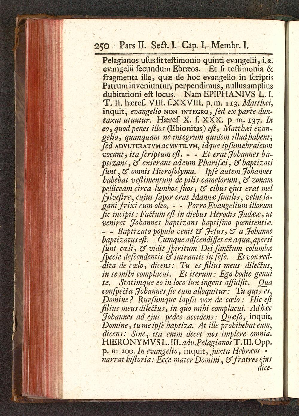 Pelagianos ufusfitteftimonio quinti evangelii, i.e.evangelii fecundum Ebrseos. Et fi teftimonia &fragmenta illa, quae de hoc evangelio in fcriptisPatrum inveniuntur, perpendimus, nullusampliusdubitationi eft locus. Nam EPIPHANIVS L. I.T. II. hceref. VIII. f.XXVIII. p.m. 113. Matthzi,inquit, evangelio non integro, fed ex parte dun-taxat utuntur. Haeref X. f. XXX. p. m. 137. Ineo , quod penes illos (Ebionitas) eft, Mattbxi evan-gelio, quanquam ne integrum quidem illudbabent,fed ADVLTEKATVAitfCMVTiLVM, idque ipfumebraicumvocant,itafcriptumeft. - - Et eratjohannes ba-ptizans, & exierant adeum Pbariftei, baptizatifunt, & omnis Hierofolyma. Ipfe autem Johanneshabebat veftimentum depilis camelorum y & zonampelliceam circa lumbos fuos , fir" cibus ejus erat mclfylveftre^ cujus fapor erat Manna Jimilis, velutla-gani jrixi cum oleo, - - PorroEvangeliumillorumJic incipit: Facium eft in diebus Herodis Judaa, utveniret Johannes baptizans baptifno poenitentine.— Baptizato populo venit & Jefus, & a Johannebaptizatus eft. Cumque adjcendijjet ex aqua, apertifunt cceli, bf vidit fpiritum Dei fanffum columbsfpecie dejcendentis & intrantis in fefe. Et voxred-dita de coelo, dicens: Tu es filius meus dileclus,in te tnihi complacui. Et iterum: Ego hodie genuite. Statimque eo in loco lux ingens ajfulfit. Quaconfpe&a Johannes fic eum alloquitur: Tu quis es,Domine? Rurfumque lapfa vox de ccelo : Hic eftfilius meus dileclus, in quo mibi complacui. Adb&cJobannes ad ejus pedes accidens: Qutsfb, inquit,Domine, tumeipfe baptiza. At ille probibebat eum,dicens: Stne, ita enim decet nos implere omnia.HIERONYMVS L. llLadv.PelagianosTAllOpp.p. m. 200. In evangeiio, inquit, juxta Hebreeos -narratbiftoria: Ecce mater Domini, & fratresejus