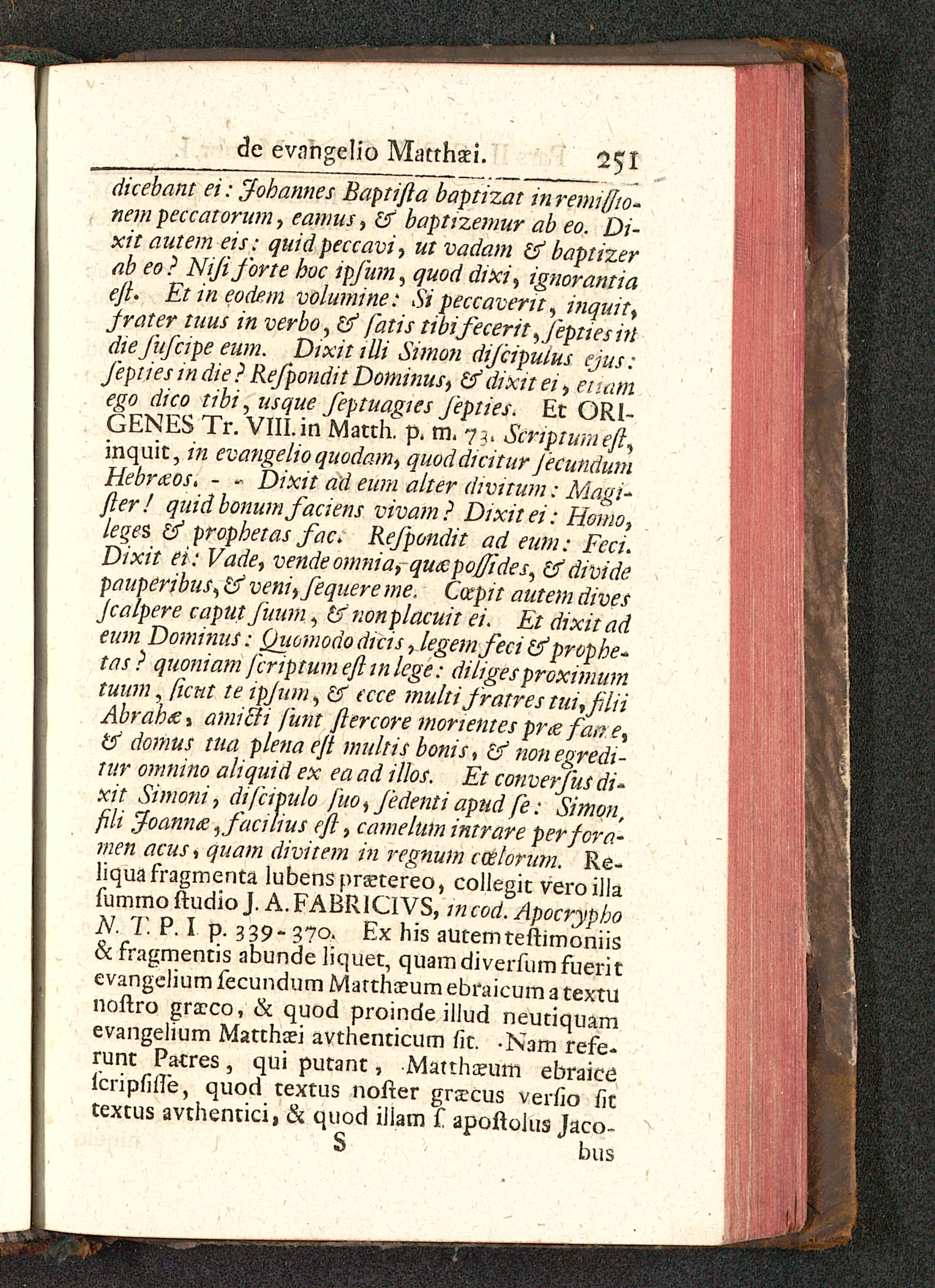 dicebant ei: $obannes Baptifta baptizat in remiffw-nempeccatorum, eamus , £f baptizemur ab eo. Di-xit autem eis: quid peccavi, ut vadam & baptizerab eo ? Nijiforte boc ipfum , quod dtxi, ignorantiaeft. Etineodem volumine: Si peccavertt , inqmt,jrater tuus in verbo, & fatis tibifecerit ^fepttesiildiefufcipe eum. DixitiUi Simon difcipuius ejus:Jepties in die ? Refpondit Dominus, & dixit ei , etuimego dico tibi,usque feptuagtes Jepties. Et ORI-GENES Tr. VIII. in Matth. p. m. 73, Scriptumeft,inquit, in evangelio quodam, quoddtcitur JecundumHebrueos. - m Dixit ad eum alter divttum: Magi-fter! quid bonumfaaens vivam? Dtxitei: Homo,leges 6f propbetas fac. Refpondit ad eiwi: Fcct.Dixit ei: Vade, vende omnia, qu&poffides, dfdividepauperibus, & veni, fequere me. Cotpit autem divesJcalpere caput Juum , & nonplacuit ei. Et dixitadeum Dominus: Quomododicis, legemfecitfprophe-tas? quoniam fcriptumeftinlege: diligesproximumtuum, [ictit te ipjum, & ecce multi fratres tui,filiiAbrabtfi ami&i funt ftercore morientes prie far,r.£ ttj domus tua plena eft multis bonis, & nonegredi-tur omnino aliquid ex ea ad illos. Et converfus di-xit Simoni, dtfapulo fuo, Jedenti apud fe: Simon,fli ,foann<e ,faalius eft, camelum intrare perfora-men acus, quam divitem in regnum ccelorum. Re-liquafragmenta lubensprstereo, collegit veroillafummoftudio J. A.FABRICIVS, tncod. ApocrypboN. T. P. I p. 339-370. Ex his autemteftimoniis& fragmentis abunde liquet, quamdiverfumfueritevangelium fecundum Marthaeum ebraicum a textunoftro gra?co, & quod proinde illud neutiquamevangelium Matthaei avthenticum fit. -Nam refe-runt Patres, qui putant, Matthaeum ebraicelcripfifle, quod textus nofter grscus verfio fittextus avthentici, & quod illam f apoftohis Jaco-
