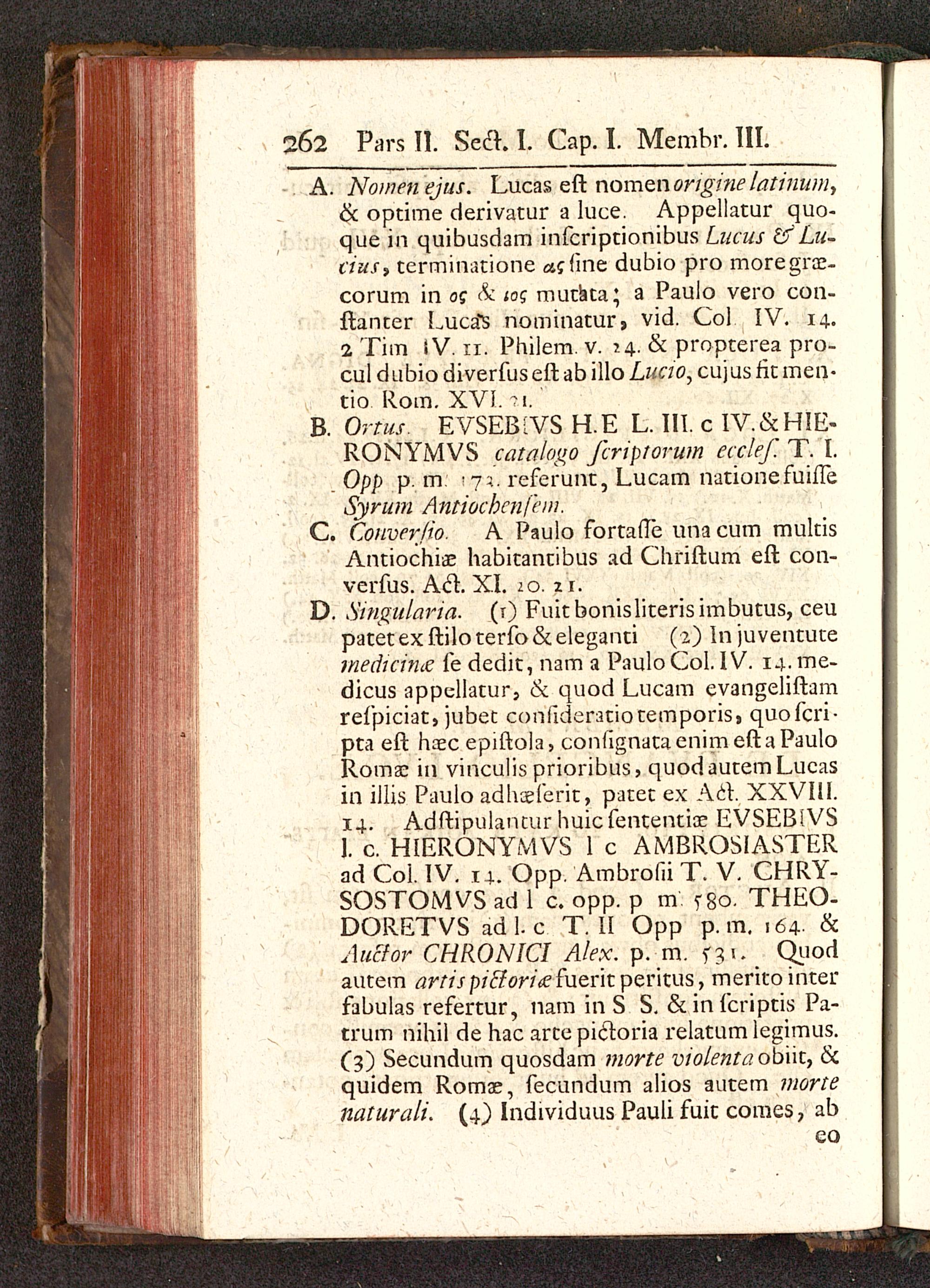 D. Singularia. (r) Fuitbonisliterisimbutus, ceupatetex ftilo terfo &eleganti (2.) In juventutemedicitne fe dedit, nam a Paulo Col. IV. 14. me-dicus appellatur, & quod Lucam evangeliftamrefpiciat, jubet coniideratiotemporis, quofcri-pta eft haec epiftola, confignataenimeftaPauloRomae in vinculis prioribus, quodautemLucasin illis Paulo adhaeferit, patet ex Act. XXVIU.14. Adftipulantur huicfententiae EVSEBiVSj: c. HIERONYMVS 1 c AMBROSIASTERad Col. IV. 14. Opp. Ambrofii T. V. CHRY-SOSTOMVS ad 1 c. opp. p m. t8o. THEO-DORETVS adl. c T. II Opp p. m. 164. &Aucfor CHRONICI Alex. p. m. f£r, _ Qviodautem artis pitlori<e fueritperitus, meritointerfabulas refertur, nam in S S. ckinfcriptis Pa-trum nihil de hac arte pictoria relatum legimus.(3) Secundum quosdam morte violenta obiit, &quidem Romae, fecundum alios autem mortenaturali. (4) Individuus Pauli fuic comes, ab