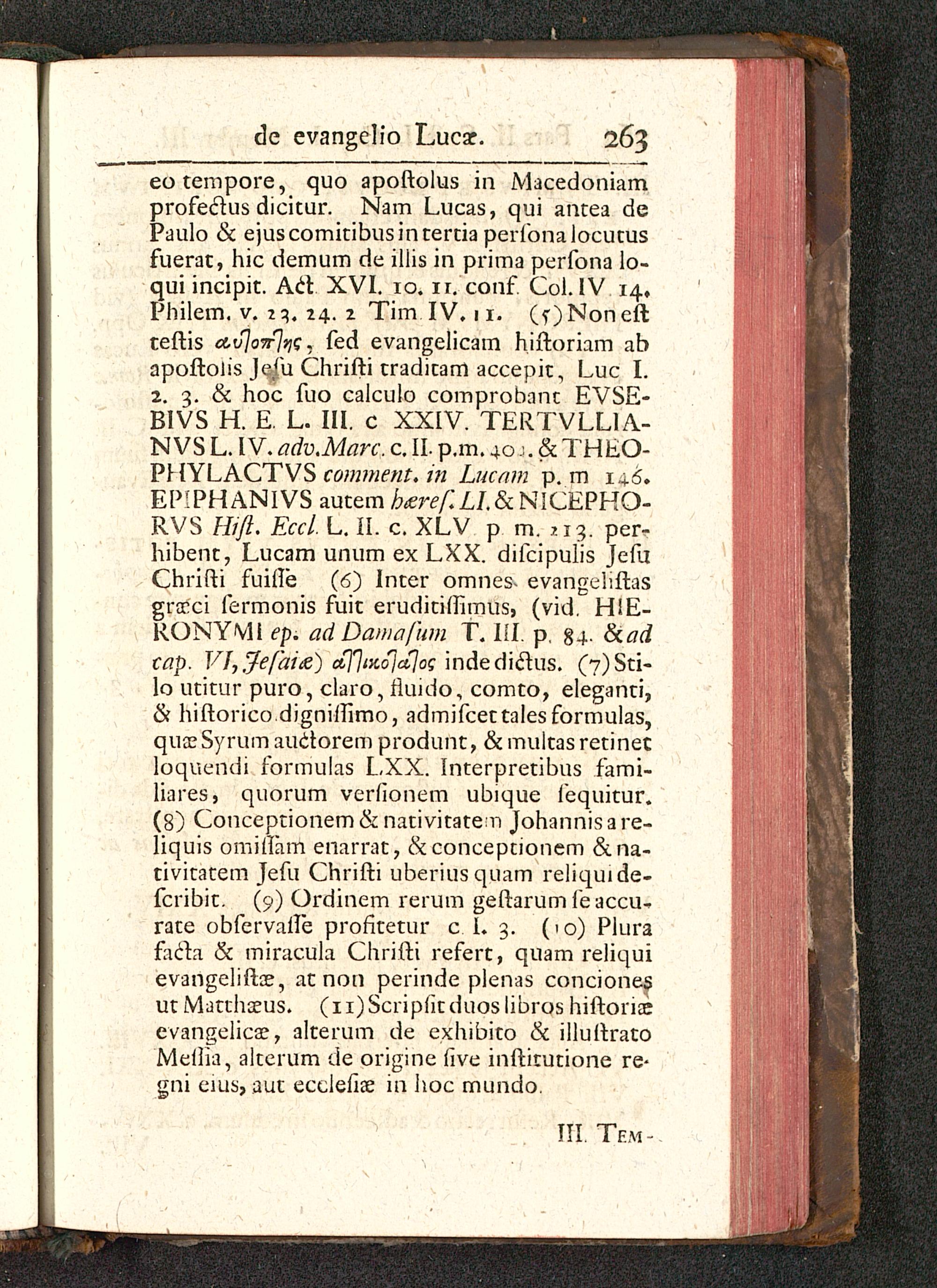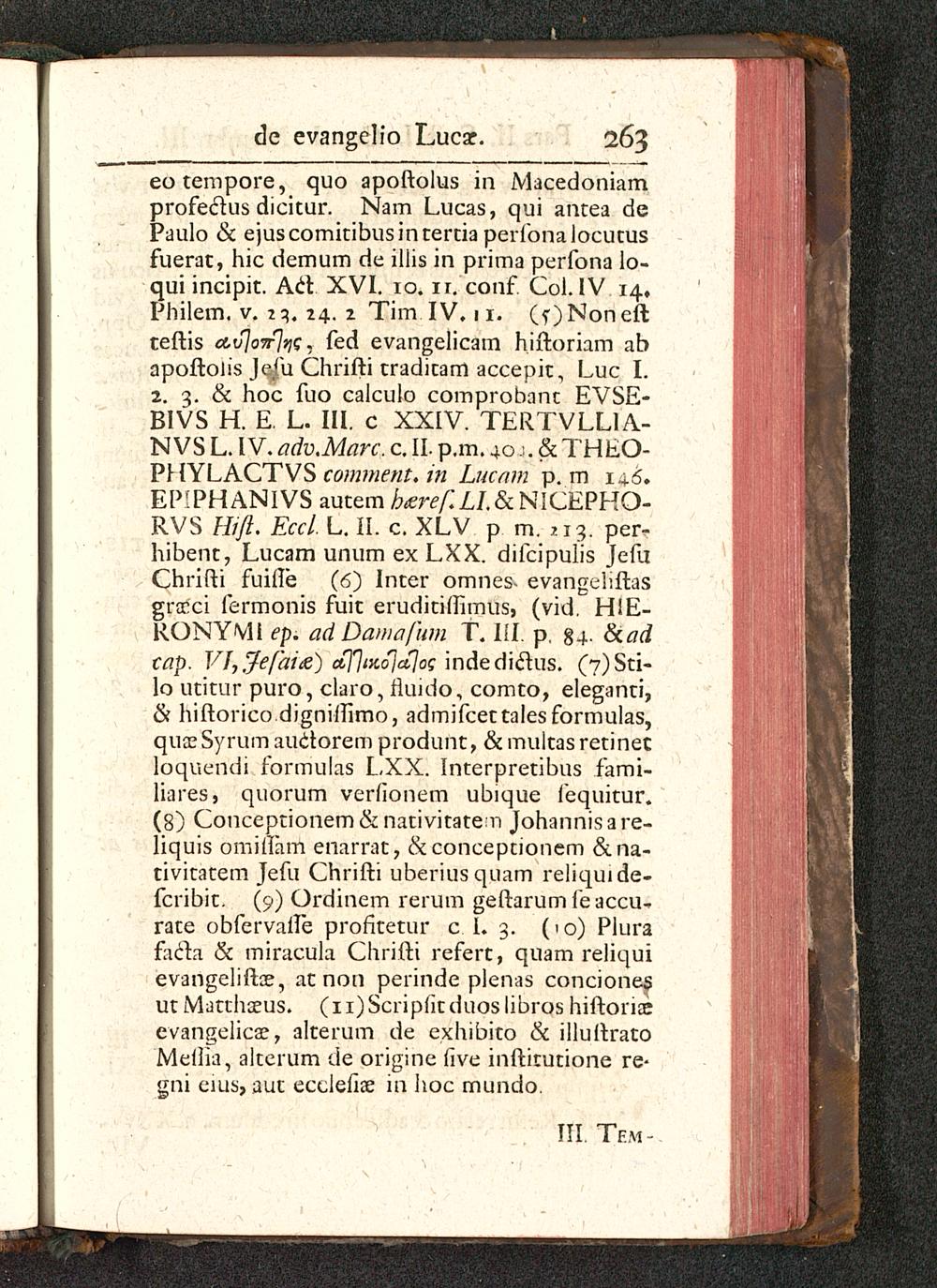eotempore, quo apoftolus in Macedoniamprofeclus dicitur. Nam Lucas, qui antea dePaulo & ejuscomitibusintertia perfonalocutusfuerat, hic demum de iliis in prima perfona lo-qui incipit. Acl XVI. 10. ir. conf Col. IV 14,Philem. v. 2 3. 24. 2 Tim IV. 11. (5-) Non eftteftis a,v]o7rjqs. fed evangelicam hiftoriam abapoftolis Jeju Chrifti traditam accepit, Luc I.z. 3. & hoc fuo calculo comprobant EVSE-BIVS H. E. L. III. c XXIV. TERTVLLIA-NVS L. IV. adv.Marc. c. II. p.m. 40 \. & THEO-PHYLACTVS comment. in Lucam p. m 146.EPIPHANIVS autem hteref.LLSc NICEPHO-RVS Hift. Eccl. L. II. c. XLV p m. .13. per-hibent, Lucam unum ex LXX. difcipulis JefuChrifti fuille (6) Inter omnes- evangeliftasgrccci fermonis fuit eruditiftimus, (vid. HIE-RONYMl ep. adDamafum T. III. p, 84- &adcap. V],Je[ai&) ccj^iKojajoc indediclus. (?)Sti-lo utitur puro, claro, rluido, comto, eleganti,& hiftorico digniirimo, admifcettalesformulas,quceSyrum auctorem produnt, &multasretinecloquendi formulas LXX. Interpretibns fami-liares, quorum verfionem ubique lequitur.(8) Conceptionem&nativitaten Johannisare-liquis omirlam enarrat, & conceptionem &na-tivitatem Jefu Chrifti uberiusquam reliquide-fcribit. (9) Ordinem rerum geftarum fe accu-rate obfervafte profketur c I. 3. (10) Plurafada & miracula Chrifti refert, quam reliquievangeliftce, at non perinde plenas concionesut Matthceus. (ii)Scrip(itduoslibros hiftoriceevangelicce, alterum de exhibito & illuftratoMefiia, alterum de origine five inftirutione re-gni eius, aut ecclefice in hoc mundo.