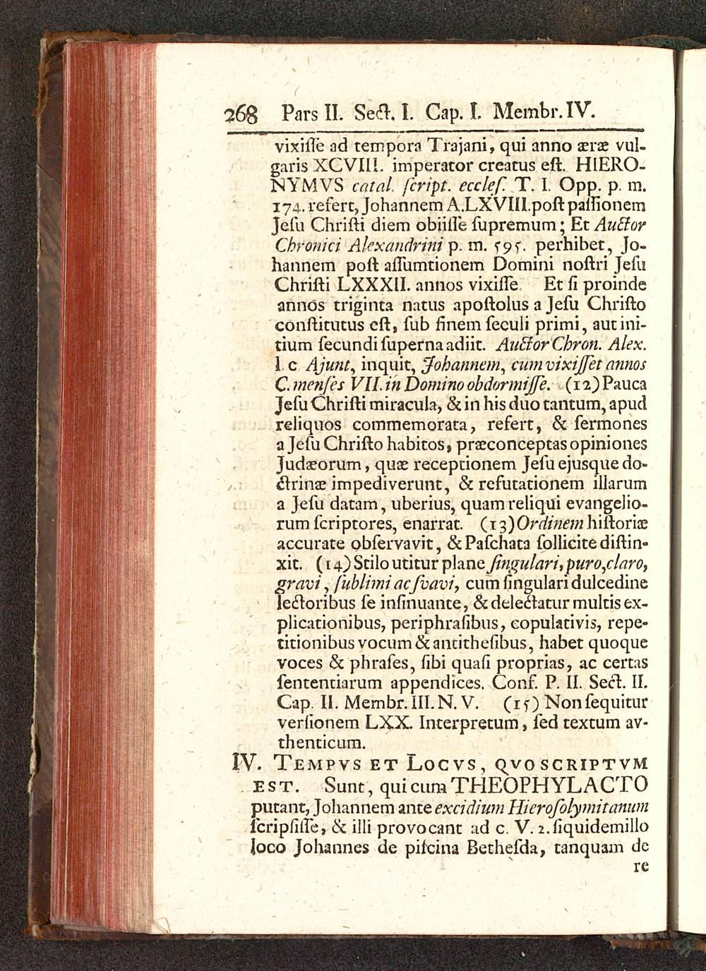 vixiile ad tempora Trajani, qui anno aerae vul-garis XCVIII. imperator creacus eft. HIERO-NYMVS catal fcript. ecclef. T. I. Opp. p. m.174. refertj Johannem A.LXVIII.poftpaffionemJefu Chrifti diem obiilfe fupremum; EtAutforChronici Alexandrini p. m. fs>f. perhibet, Jo-hannem poft aflumcionem Domini noftri JefuChrifti LXXXII. annos vixhTe Et fi proindeannos triginta natus apoftolus a Jefu Chriftoconftitutus cft, fub finem feculi primi, autini-tium fecundifupernaadiir. AuEtorCbron. Alex.\. c Ajunt, inquit, Johannem, cum vixijfet annosC. menfes VII in Domino obdormijfe. (12) PaucaJefu Chrifti miracula, & in his duo tantum, apudreliquos commemorata, refert, & fermonesa Jefu Chrifto habitos, prseconceptas opinionesJudaeorum, qua; recepcionem Jefu ejusque do-clrinjE impediverunt, & refutationem illaruma Jefu datam, uberius, quamreliqui evangelio-rum fcripcores, enarrac. ( x^)Ordinem hiftoria?accurace obfervavit, &Pafchata follicitediftin-xit. (14) Stilo utitur plane jingulari, puro/Aaro,gravi j fublimi acJvavi, cum fingulari dulcedinelecloribus fe infinuante, &delectacurmultisex-plicationibus, periphrafibus, eopulativis, repe-titionibusvocum&antichefibus, habet quoquevoces & phrafes, fibi quafi proprias, ac certasfenrenciarum appendices. Conf. P. Hi Secl. II.Cap. II. Mernbr.III.N. V. (if) Nonfequicurverlionem LXX. Incerpretum, fed textum av-thenticum.