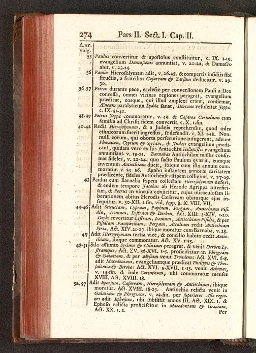 familia ad Chrifti fidem convertit. c. X. i-fin.Redit Hierofolymam, & a Judaeis reprehenfus, quod aedesethnicorum fuerit ingreffus, fedefendit. c. XI. 1-18. Non-nulli eorum, qui oborta perfecutioneaufugerant, adeuntl'hoenicen, Cyprum & Syriam, dc Judais evangelium praedi-cant, quidam vero ex his Antiuchiae Helleniftis evangeliumannuntiant. v. 19-21. Barnabas Antiochiam miffus confir-mat fideles, v. 22-24. quo fadto Paulum qv*rit, eumqueinventum Antiochiam ducit, ibique cum illo annum com-rnoratur. v. 25. a<$. Agabo inftantem annonae caritatemprsedicente, fidelesAntiochenfesftipem colligunt. v. 27-J9.Paulus cum Barnaba ftipein colledtam Hierojoiymam defert,6c eodem tempore Jacobus ab Herode Agrippa interfici-tur, <k Petrus in vincula conjicitur, cujus ihiraculofam Ji-berationem abitus Herodis Caefaream obitusque ejus in-fequitur. v. 30-XII. i-fin, vid. App. §. X. VIII. VII.Adit Seleuctam, Cyprum , Paphum, Pergam , Antibchiam Pift-dia , Iconium, Lyftram & Derben. Ac~t. XIII. 3-XIV. I-20.Derbe revertitur Lyftram, Icontum , Anticchiam PijidU, & perPijidiam Pampkyliam, Pergam, Attaliam redit AntiochtamSyrU, Act. XIV. 21-27. ibique moratur cumBarnaba. v.28.Adit Hierojolymam tertia vice, & concilio habito rz&itAntio-