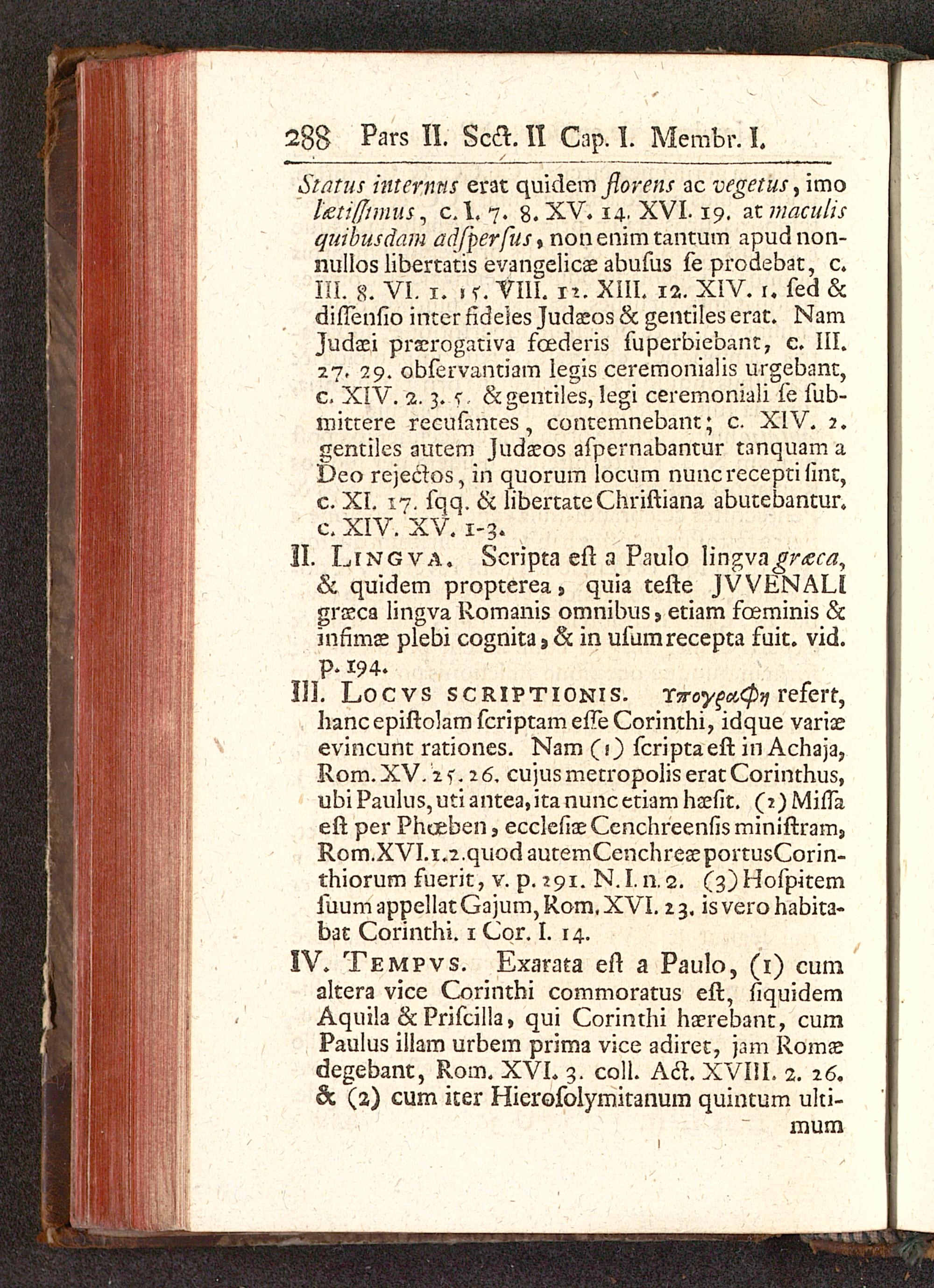 Status hitcrnns erat quidem fiorens ac vtgetfysi imoletrfttmus , c.l. 7. 8. XV. 14. XVI. 19. atmaculisquibusdam adfperfus* nonenimtantum apudnon-nullos libertatis evangelicae abufus feprodebat, c.III. 8. VI. 1. 1 r. VIII. 11. XIII. 12. XIV. r. fed &diflenfio inter fideies Judasos & gentiles erat. NamJudaei praerogativa fcederis fuperbiebant, e. III.27, 29. obfervantiam legis ceremonialis urgebant,c. XIV. 2. 3. v &gentiles, legi ceremoniali fe fub-mitrere recufantes, contemnebant; c. XIV. 2.gentiles autem Judaeos afpernabantur tanquam aDeo rejectos, in quorum locum nuncreceptilint,c. XI. 17. fqq. & libertateChriftiana abutebantur.c. XIV. XV. 1-3.