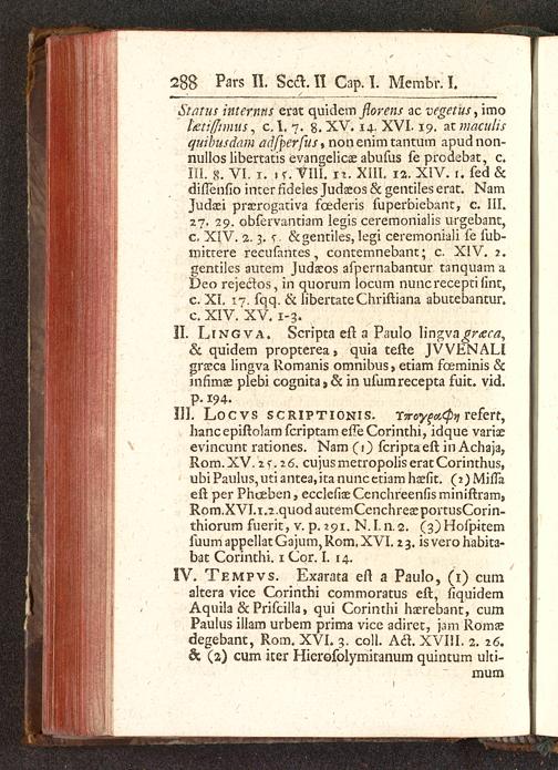 IJI. Locvs scriptionis. rjroy^^ referr,hancepiftolam fcriptam effe Corinthi, idque variaeevincunt rationes. Nam (i) fcriptaeft in Achaja,R0m.XV. 2f. 26. cujusmetropoliseratCorinthus,ubiPaulus,utiantea,itanuncetiam haefit. (2) Mifiaeft per Phceben , ecclefiaeCenchreenfisminiftram,Rom.XVI.i.2.quodautemCenchreseportusCorin-thiorum fuerit, v. p. 291. N.I. n.2. (3) HofpitemluumappellatGajum,Rom,XVI. 23, isverohabita-bat Corinthi. 1 Cqr. I. 14.