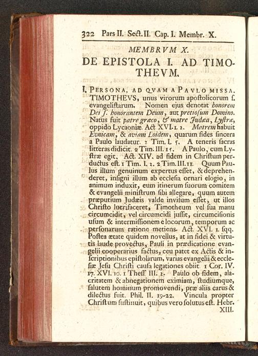 T, Persona, ad qvamaPavlomissa.TIMOTHEVS, unus virorum apoftolicorum f.evangeliftarum, Nomen ejus denotat honoremDeif honorantem Deum^ mtpretiofum Domino.Natus fuit patre gr&co, & matn' Judfia , Lyftne,oppido Lycaonia?. Acl XVI.1. i. Mo.trem habuitEvnicam> & aviam Loidem% quarum fides finceraa Paulo laudatur. % Tim. I. f. A teneris facraslitterasdidicit. 2Tim.III.1r. APaulo, cumLy-ftrae egit, A6i XIV, ad fidem in Chriftumper-duclus eft. 1 Tim. 1.1. 2Tim.III.11. Quum Pau-Ius illum genuinum expertus efiet, &deprehen-deret, infigni illum ab ecclefia ornari elogio, inanimum induxit, eum itinerum fuorum comitemocevangelii miniftrum fibi allegare, quum autempraeputium Judaeis valde invilum eflet, ut illosChrifto lucrifaceret» Timotheum vel fua manucircumcidit, vel circumcidi juflit, circumcifionisufum & intermiflionemelocorum, temporum acperfonarum ratione metiens. Act. XVI. 1. fqq.Poftea aetate quidcm novellus, at in fidei & virtu-tis laude proveclus, Pauli in praedicatione evan-gelii cooperarius faftus, ceu patet ex Aclis & in-fcriptionihus epiftolarum, varias evangelii&eccle-fiae Jefu Chrifti caufa legationes obiit. 1 Cor. IV.17. XVI. 10.1 ThefT III. .2. Paulo ob fidem, ala-critatem & «ibnegationem eximiam, ftudiumque,falutem hominum promovendi, prae aliis carus&dileclus fuit. Phil. II. 19-22. Vincula propterChriftum fuftinuit, quibus verofolutuseft. Hebr.