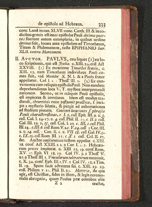 II. Avctor. PAVLVS, ceuliquet (i)exlo-co fcriptionis, qui eft 'Jtalia. cXIU.24.coH A&XXVIII. (1) Ex mentione Timotbei fratris, c.XIII. 13, nam Timotheus individuus Pauli co-mes fuitj vid. Membr X. N. I. & a Paulo fraterappellatur. Col. I. 1. 1 Thefl* III. 2. (^)Excon-venientiacum reliquisepiftolisPauli Nameandemdeprehendimus loca V. T. myftice interpretandirationem Sermo, utin reliquis Pauli epiftolis,eft implexus & involutus. Idem cft modus tra-clandi, theoreticis enim poftponit praciica , f incl-pit a myfterio falutis, & pergit ad exhortationesad ftudium pietatis. Continet locutiones f.pbrafesPauli cbaracleri/licas, c 1.2. coll. Eph. IIL 9. v.j.coll. Col. L 14-17. v. 4. coll Phil. II. 1?. c. II.2 colLGal. III. 19. v. ij. coll. Col. L 20. c. III. i.colL?h\lIII. 14.. cJIL 6. coll. Rom.V.2.c. V.14. coll 1 Cor. III.a. v. 14. coll. , Cor. II. 6. c. VII ig. coll.Gal IV.?.c. IX.15.colI.Rom III. 3if f c.X 1. coil. Ccl. II. 17.&c. Auclor «?«/o>«n<7/w teftern appeilat. c.XIII.18. conf. Adt. XXIII. 1.2. 2 Cor I. i. 2, Hebraeo-rum preces implorat. c, XIII ig, 19. conf.Rom»XV. 10. Eph. VI 18. 19. Col IV. 3.1 Theff V.2f.2ThefriII. r. Vmculorumtoleratorummem\ri\t.c. X. 34. conf. Eph. III. t. IV. t Col.IV. . 8.*Tim.II. 19. Spem facit adventus fui. c. Xlll. 19. 23.coll. Philem. v. 22. Phil. II. 21. Materia, de quaagit,eft Chriftus, fides in illum, & legisceremo-nialis abrogatio, quam Paulus prse omnibus aliisZ 2 craclat,