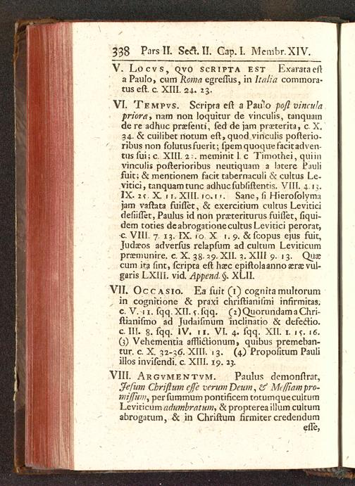 VI. Tempvs. Scripra eft a Paulo fojl vinculapriora* nam non loquitur de vinculis, tanquamde re adhuc praefentt, fed de jam praeterita, c. X.34. & cuilibet notum eft,quod vinculis pofterio-ribusnon folutusfuerit; fpemquoquefacitadven-tus fui; c. XIII. 2-. meminit 1. c Timothci, quiinvinculis pofterioribus neutiquam a latere Baulifuit; & mentionem facit tabernaculi & cultus Le-vitici, tanquamtunc adhucfubfiftentis. VIII. 4.13.IX. z-f.i X. 11. XIII. 10.1'. Sane, fi Hierofolymajam vaftata fuiflet, & exercitium cultus Leviticidefiiflet, Paulus id non prceteriturus fuiflet, fiqui-dem toties deabrogationecultus Levitici perorat,c. VIII. 7, 13. IX. 10. X 1. 9. & fcopus ejus fuit,Judaeos adverfus relapfum ad cultum Leviticumpraemunire. e. X. 38 29. XII. 3. XIII 9. 13. Qiiaecum ita fint, fcripta eft haec epiftolaannoaerae vul-garis LXIII. vid. Append. §. XLII.