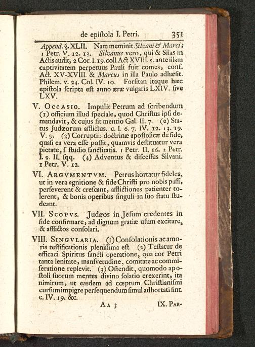 V. Occasio. Impulit Petrum ad fcribendum(1) officium illud fpeciale, quod Chriftus ipfi de-mandavit, & cujus fk mentio Gal. II. 7. (2) Sta-tus Judasorum affliclus. c. L 6. 7. IV. i%, 13. 19.V. 9. (3) Corruptio do6trinae apoftolicx de fide,quafi ea vera efTe poffic, quamvis deftituatur verapiecate,f ftudio fanclitatis. r Petr. II. 16. 2 Petr.X. 9. II. fqq. (4) Adventus & difceiTus Silvani.1 Petr, V. 12.
