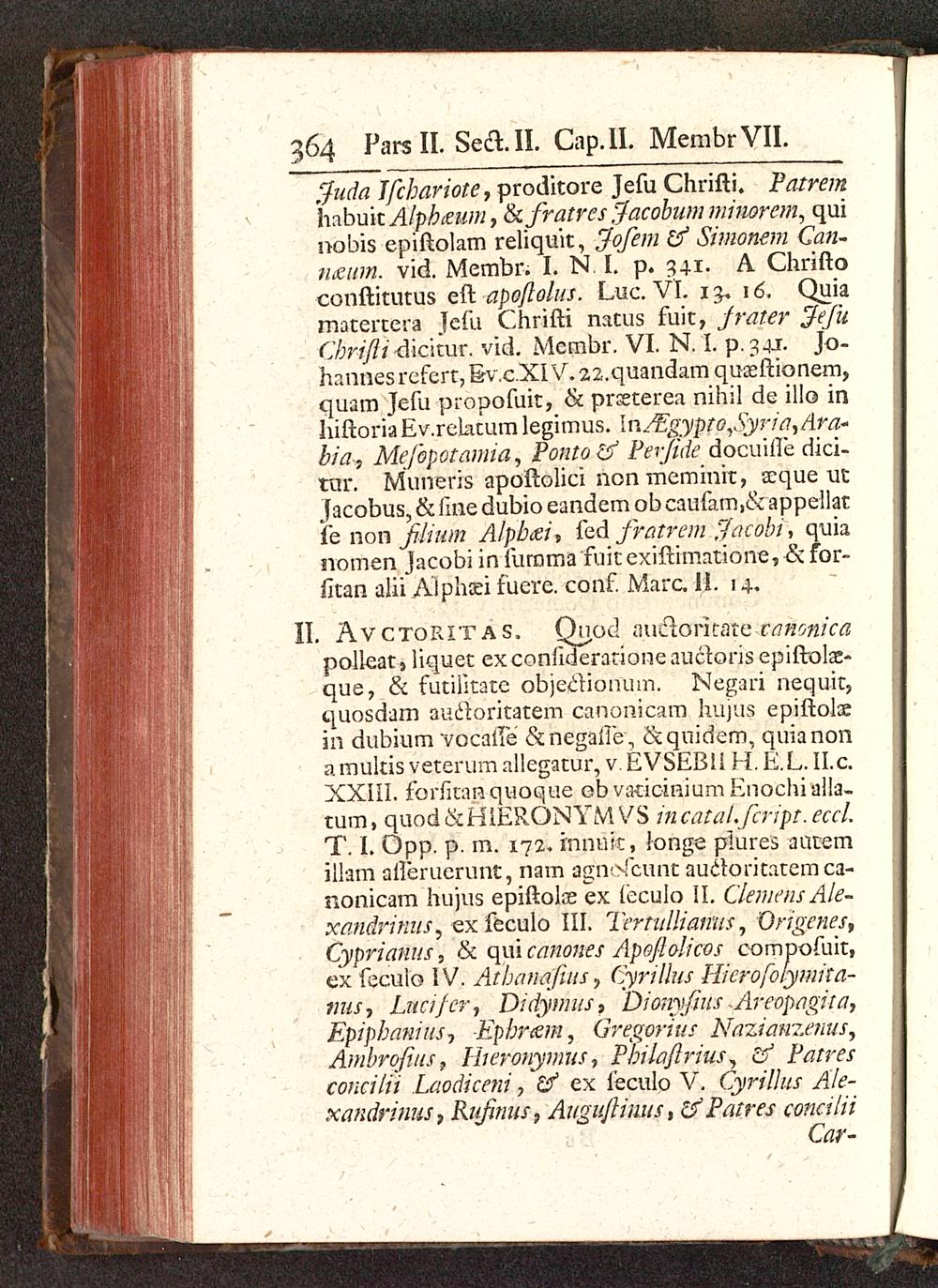 II. Avctoritas. Quod m&omcitc canonicapolleat, liquet exccnfiderationeauctorisepiftolae-que, & futiiitate objectionum. Negari nequit,quosdam audoritatem canonicam hujus epiftolcein dubium vocafle &negaHe , &quidem, quianona multis veterum allegatur, v. EVSEB!! H. E.L. II. c.XXIII. forfitanquoque obvsdciniurnEnochialla-tum, quod&HiERONYM VS incataLfcript.eccLT. L Opp. p. m. 172, innurt, longe plures autemillam afleruerunt, nam agn^fcunc auctoritatemca-nonicam hujus epiftolce ex feculo II. Clemens Ale-xandnnus^ exfeculo III. Tertullianus , Vrigenes,