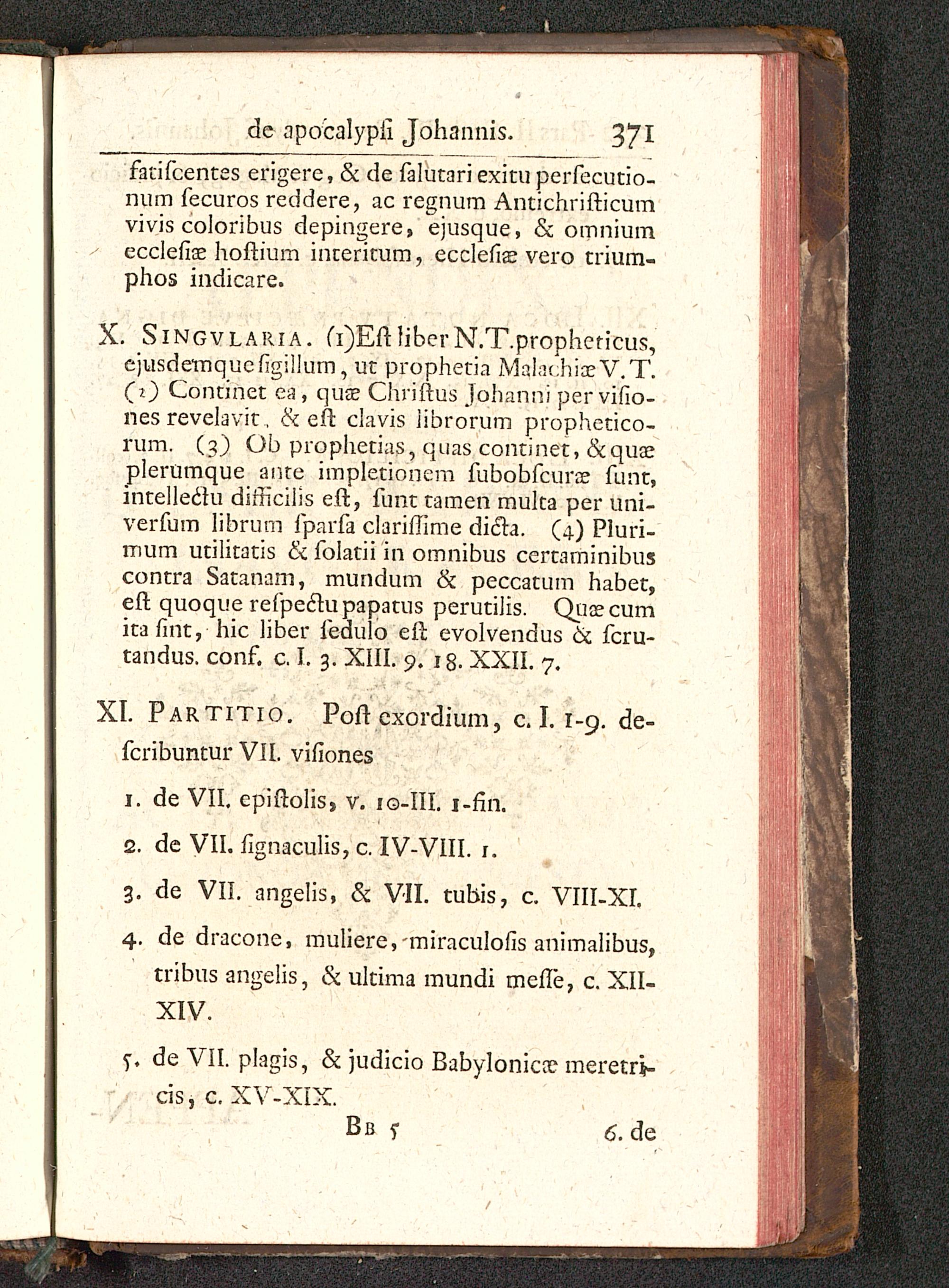 X. Singvlaria. (i)EftliberN.T.propheticus,ejusdemquefigillum, ut prophetia Malachiae V.T.(0 Continet ea , quae Chriftus Johanni per vifio-nes revelavit, & eft clavis iibrorum prophetico-rum. (3) Ob prophetias, quas continet,&quaeplerumque ante impletionem fubobfcuroe funt,intelleciu diriicilis eft, funt tamen multa per uni-verfum librum fparfa clariffime dicta. (4) Pluri-mum utilitatis & folatii in omnibus certaminibuscontra Satanam, mundum & peccatum habet,eft quoque refpeclupapatus perutilis. Qucecumita firit,; hic liber fedulo eft evolvendus & fcru-tandus. conf. c. I. 3. XIII. 9. 18. XXII. 7.