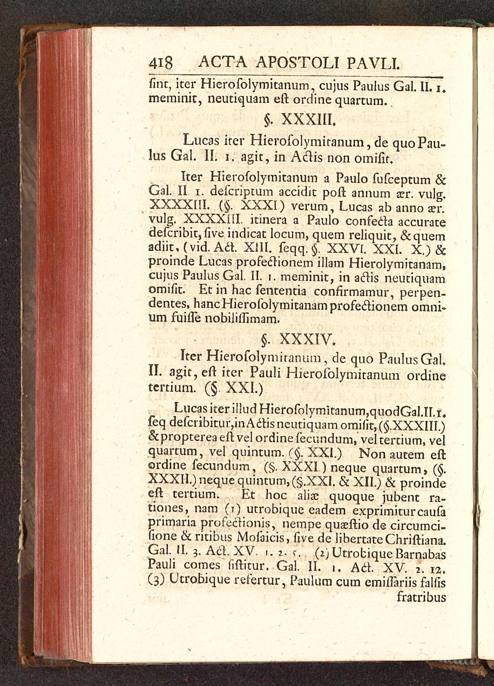 Iter Hierofolymitanum a Paulo fufceptum &Gal. II i. defcriptum accidit poft annum a?r. vulg.XXXXIII. (§. XXXI) verum, Lucas ab anno ser.vulg. XXXXHI. itinera a Paulo confecta accuratedefcribit, five indicat locum, quem reliquit, &quemadiit, (vid. Act. XIII. feqq.§. XXVI. XXI. X.) &proinde Lucas profeclionem illam Hierolymitanam,cujus Paulus Gal. II. i. meminit, in aclis neutiquamomifit. Et in hac fententia confirmamur, perpen-dentes, hancHierofolymitanamprofeclionem omni-um fuifle nobililfimam.