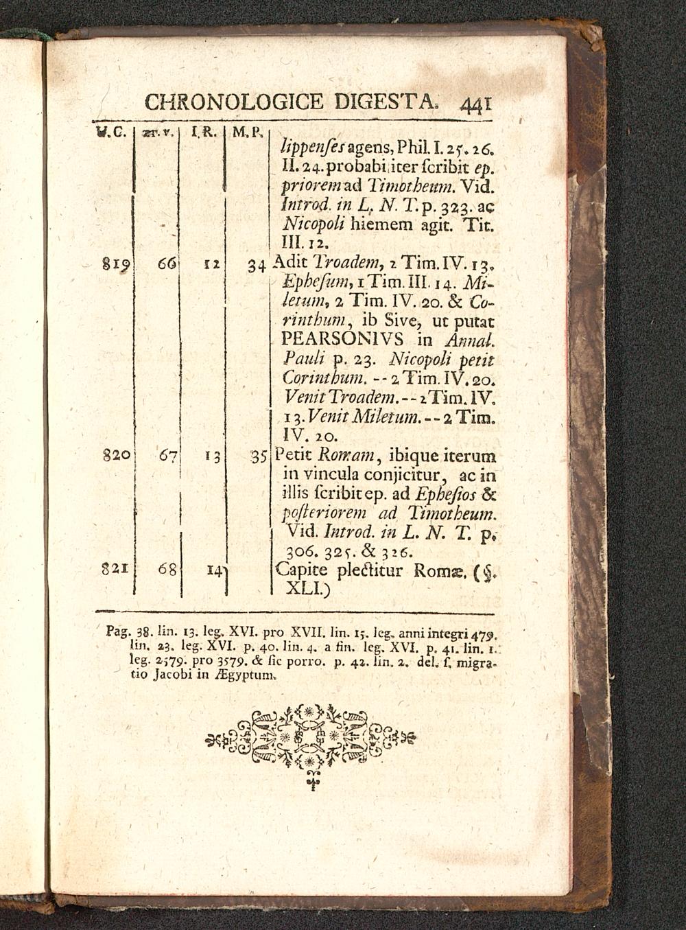 35 Petit Rowam, ibique iterumifi vincula conjicitur, ac inillis fcribitep. ad Epbejios &pojteriorem ad Timotheum.Vid. Introd. in L. N. T. p,306. 32T. & 316.Capite plectitur Roma;, (<S.XLI.)