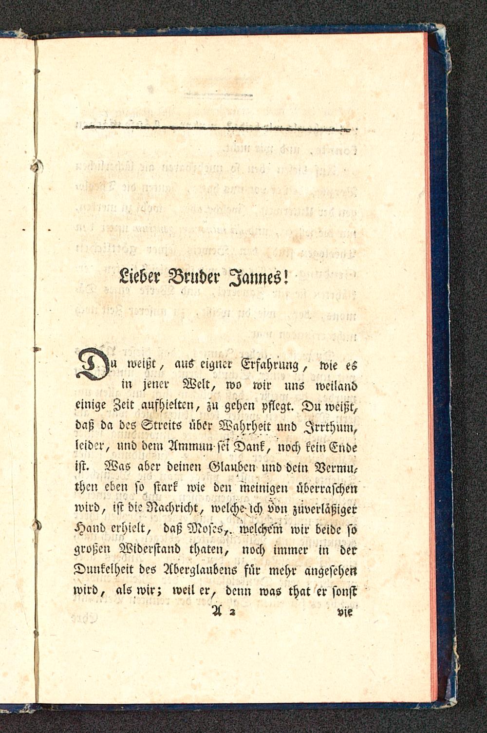 >^Hu wei>zt, aus eigner Erfahrung, wie e»in lener Welt, wo wir uns weilandeinige Zeit aufhielten, zu gehen pflegt. Du weißt,daß da des Streits über Wahrheit und Zrrthum,leider, und dem Ammun sei'Dank, noch kein Endeist. Was aber deinen Glauben und dein Vcrmu.-then eben so stark wie den meinigen überraschenwird, ist die Nachricht, welche-ich von zuvcrläßigerHand erhielt, daß Moses, , welchem wir beide sogroßen Widersrand thaten, noch immer in derDunkelheit des Aberglaubens für mehr angesehenwird, als wir; weiter, denn was that er sonstA - vi«