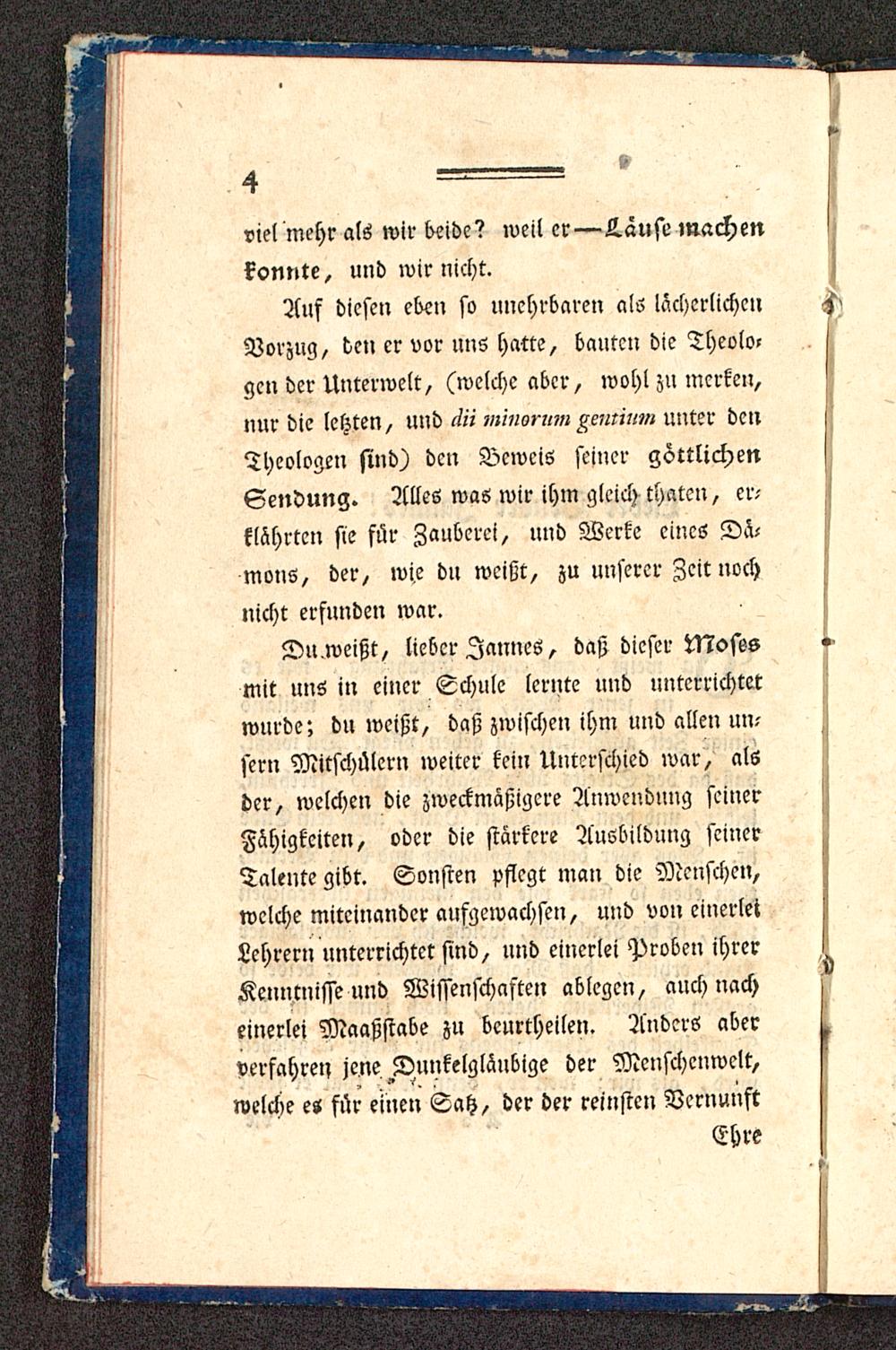 Du weißt, lieber Zannes, daß dieser Mosesmit uns in einer Schule lernte und unterrichtetwurde; du weißt, daß zwischen ihm und allen un-sern Mitschülern weiter kein Unterschied war, alsder, welchen die zweckmäßigere Anwendung seinerFähigkeiten, oder die stärkere Ausbildung seinerTalente gibt. Solisten pflegt man die Menschen,welche miteinander aufgewachsen, und von einerleiLehrern unterrichtet sind, und einerlei Proben ihrerKenntnisse und Wissenschaften ablegen, auch nacheinerlei Maaßsrabe zu beurtheilen. Anders aberverfahrei, jene Dunkelgläubige der Mcnschcnwclr,welche es für einen Satz, der der reinsten Vernunft