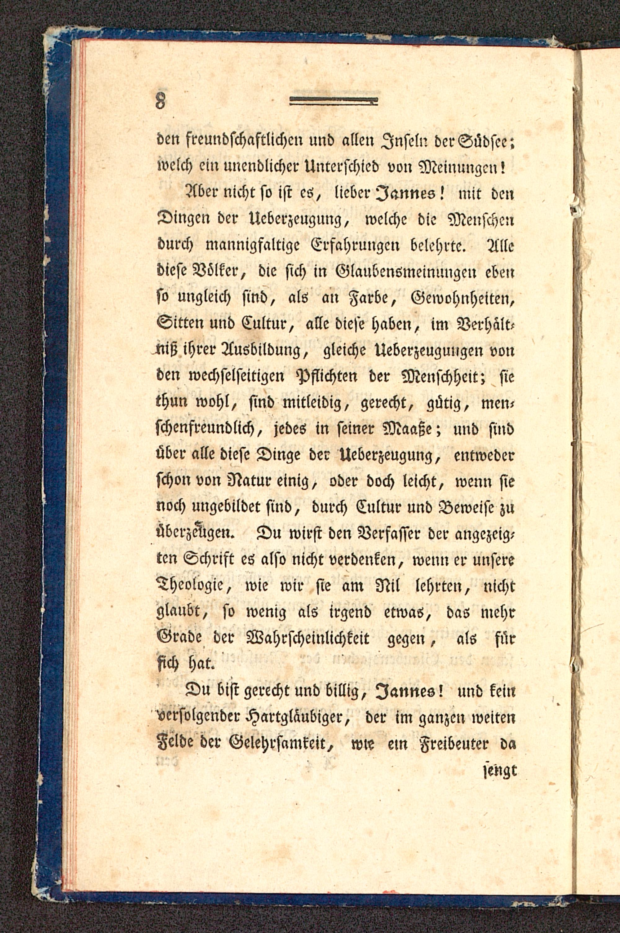 Aber nicht so ist es, lieber I-mnes! mit denDingen der Ueberzeugung, welche die Menschendurch mannigfaltige Erfahrungen belehrte. Allediese Völker, die sich in Glaubensmeinungcn ebenso ungleich sind, als an Farbe, Gewohnheiten,Sitten uud Cultur, alle diese haben, im Verhält-niß ihrer Ausbildung, gleiche Ueberzeugungen vonden wechselseitigen Pflichten der Menschheit; siethun wohl, sind mitleidig, gerecht, gütig, men-schenfreundlich, jedes in seiner Maaße; und sindüber alle diese Dinge der Ueberzeugung, entwederschon von Natur einig, oder doch leicht, wenn sienoch ungebildet sind, durch Cultur und Beweise zuüberzeugen. Du wirst den Verfasser der angezeig-ten Schrift es also nicht verdenken, wenn er unsereTheologie, wie wir sie am Nil lehrten, nichtglaubt, so wenig als irgend etwas, das mehrGrade der Wahrscheinlichkeit gegen, als fürsich hat.